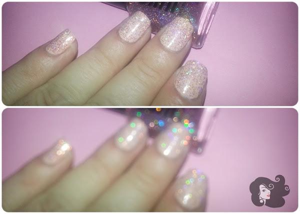 El rosa de la colección, es super femenino, en este caso usé una base rosa muy clarita, tirando a salmón y el resultado fue genial, si bien en la foto enfocada van a ver que el glitter es muy notorio porque la base es clara, cuando salís al sol explota!