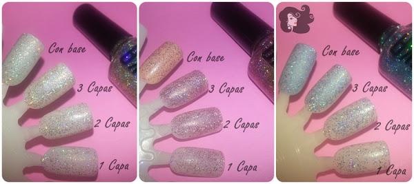Cobertura: Si los aplicas sobre una base de color con una capa sola es más que suficiente ya que el pincel carga bastante glitter, así que proble:mas con la aplicación no van a tener.