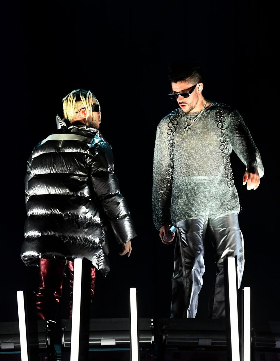El cantante puertorriqueño que ganó su primer galardón por el mejor álbum de pop latino en los Grammy 2021 gracias al disco YHLQMDLG, apostó por un look monocromático de la firma Burberry. Un vestido camisero con falda plisada y un abrigo clásico del mismo color, a juego con medias negras y unas combat boots.El cantante quiso darle un toque diferente a su outfit luciendo unas gafas amarillas que hacían juego con un girasol y un curioso gorro negro con orejas de conejo.
