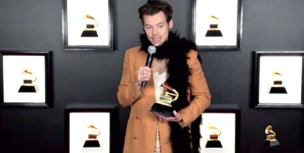 El cantante británico Harry Styles, ganó su primer Grammy a la Mejor Interpretación pop solitario por ‘Watermelon Sugar‘, y se cambió hasta tres veces de vestuario.Para su posado en la alfombra roja, Styles lució unos pantalones de terciopelo marrón con una ligera campana, un chaleco de punto sin camisa debajo, una americana de cuadros, unos botines en color crudo y una boa de color violeta que llevaba en el cuello. Un look de estilo años 70.