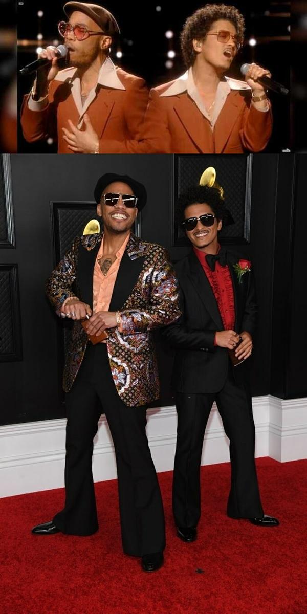 Ambos cantantes se han unido ya han creado la banda Silk Sonic, que apuesta por la mejor música de los años 70, pero también apuestan por su estética.Los artistas rindieron homenaje al fallecido Little Richard interpretando su famoso tema “Good Golly, Miss Molly”. Iban los dos perfectamente conjuntados, a juego, para la presentación en directo de su primer single, Leave the Door Open. Un tres piezas caramelo, de tamaño XXL, con los cuellos de la camisa por fuera, de Gucci.