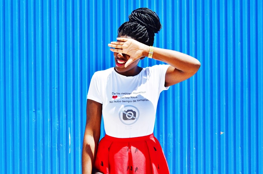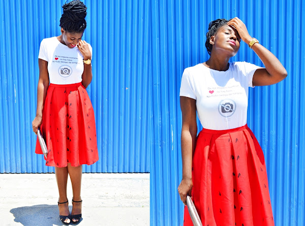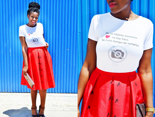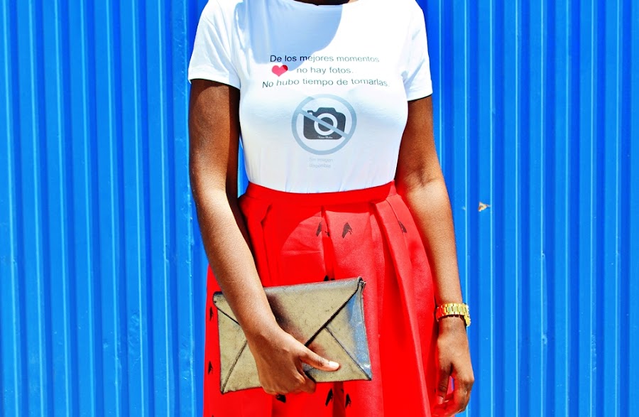 Esta era la tercera camiseta que os tenía que enseñar de Victoria Rockera, me pareció super graciosa y como no tenía que ser mía. Decidí combinarla de una forma más arreglada, y eso lo conseguí con mi falda midi de Miga (ya os la había enseñado el año pasado) y con este clutch que me regaló el año pasado MaryPaz.