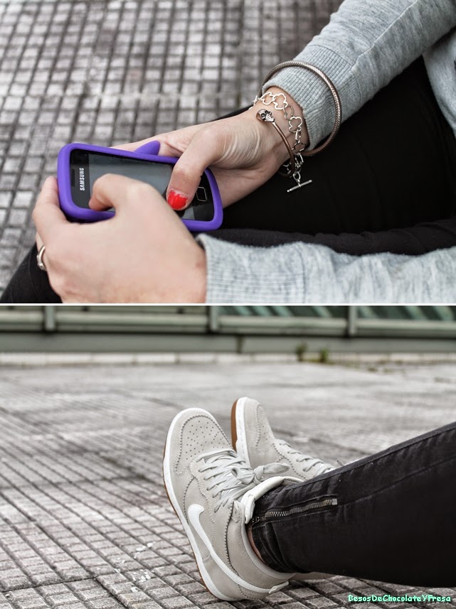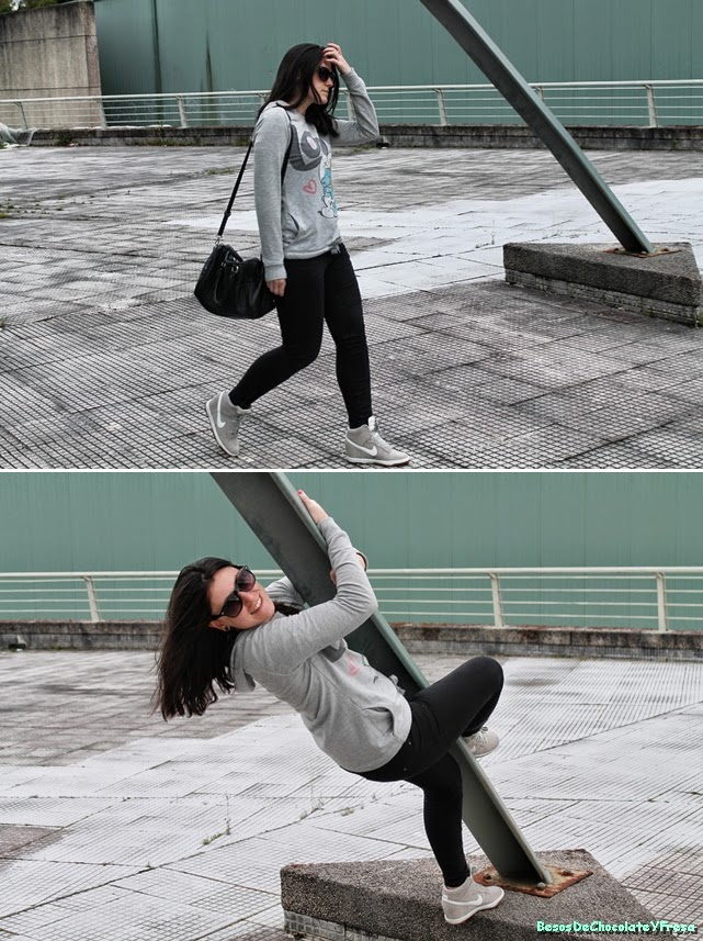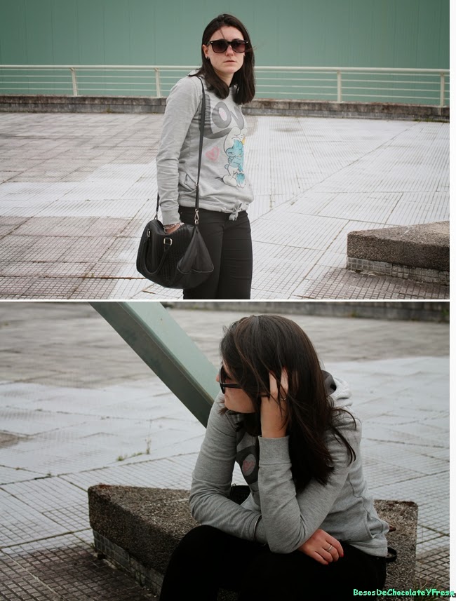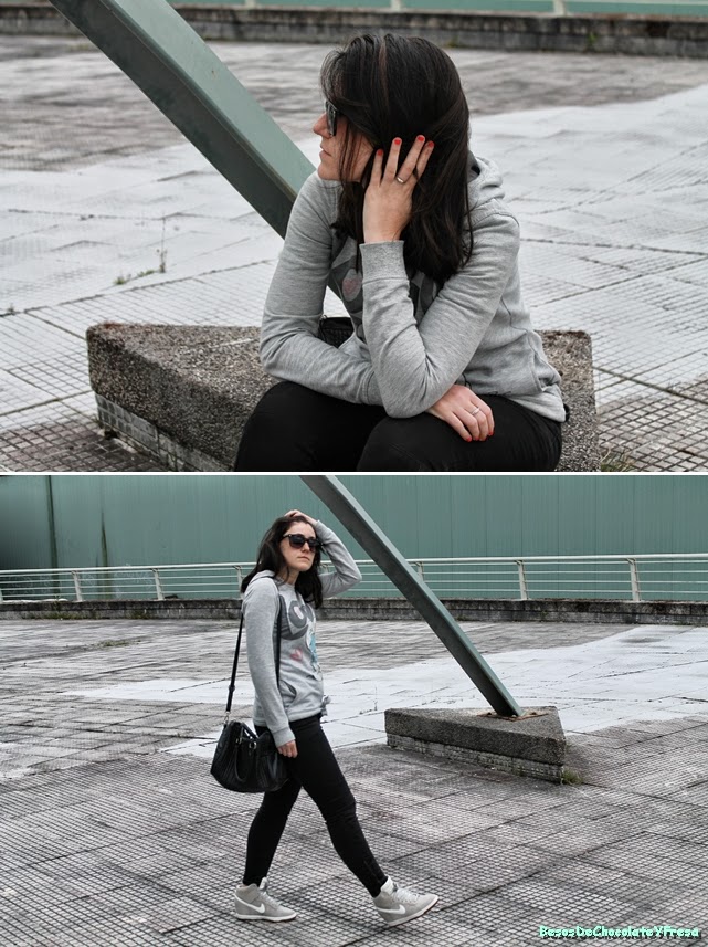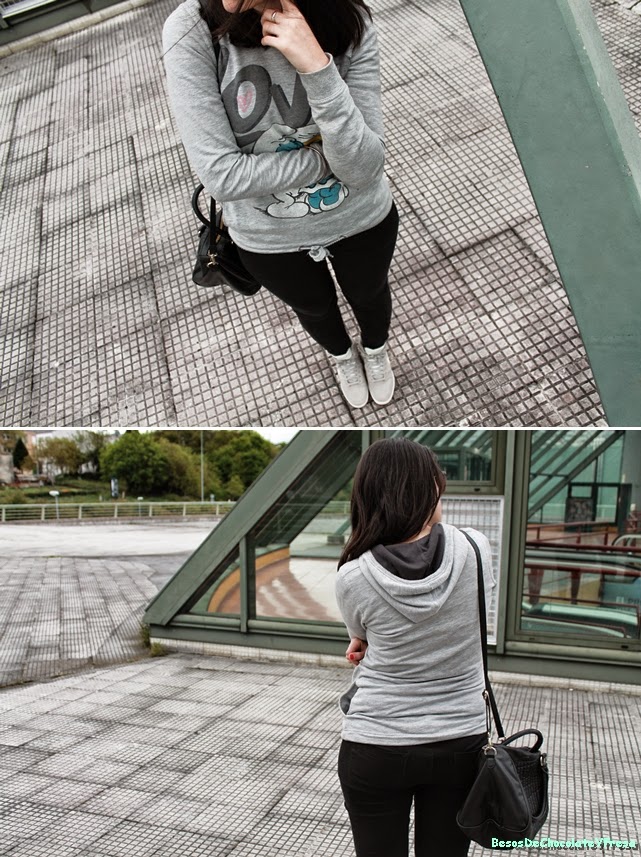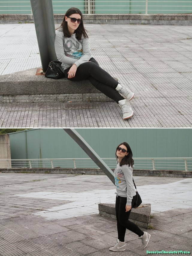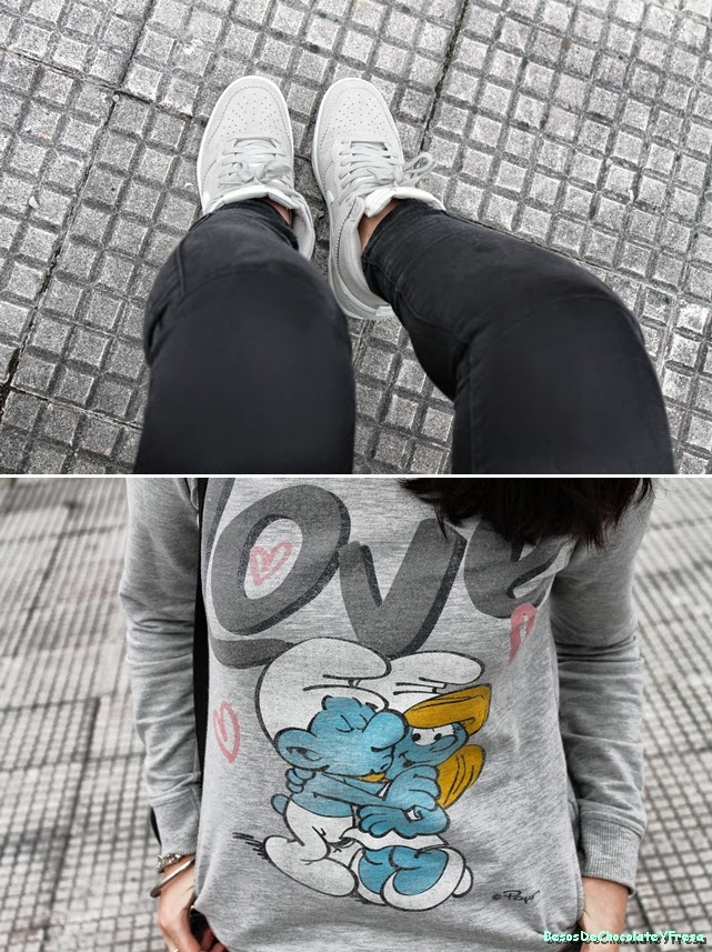 En cuanto al outfit, la semana pasada aún vinieron días nublados, por eso opté por un look cómodo en tonos grises. Para eso llevo sudadera de los Pitufos, jeans negros, sneakers con cuña interna de Nike (muy cómodas) y bolso tote en negro.