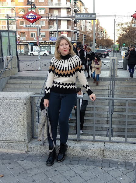 Look 8. Vaquero azul + jersey multicolor + bota militar