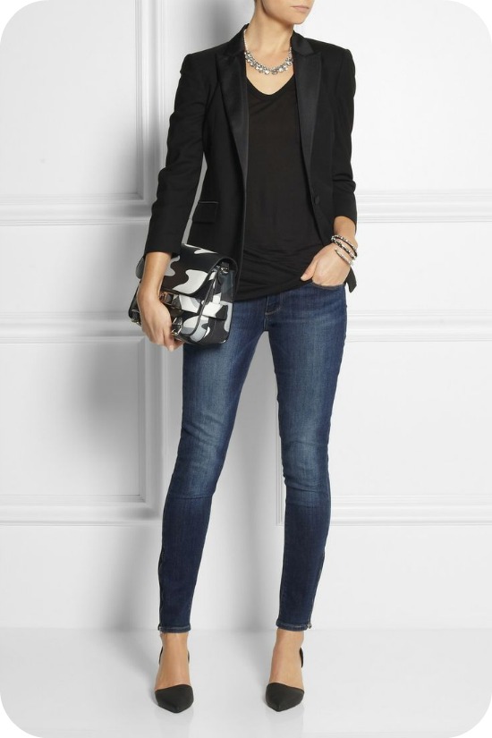 Para un look de noche o fiesta yo soy partidaria del menos es mas. Así que simplemente elijo unos jeans, a poder ser oscuritos, una camiseta/camisa y blazer en color negro y taconazos. Luego como complemente un clutch con algo de color y alguna joya, pero nada ostentosa, solo que nos den ese toque de glamour.