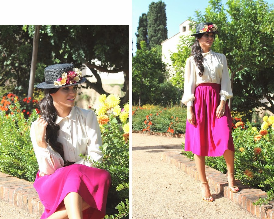 Aquí la segunda parte, ella con blusa blanca y falda midi bugambilla, yo con camisa negra y pantalón verde satinado. Escogimos como localización los bonitos jardines de La Galera, y los soportales de la Plaza Alta de nuestra ciudad. Espero que os guste, aún queda una tercera parte de la sesión