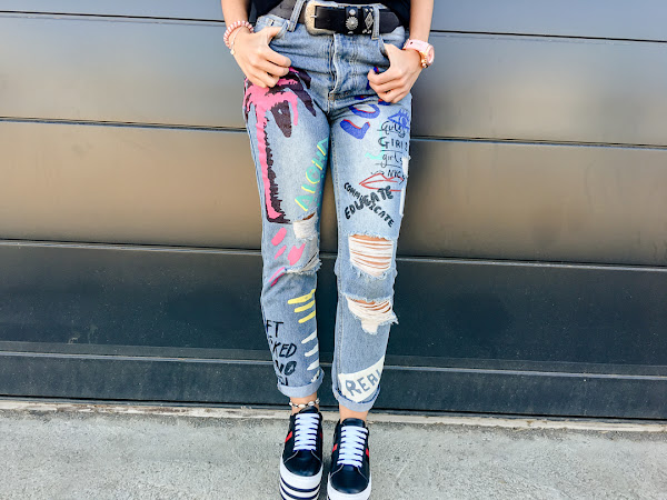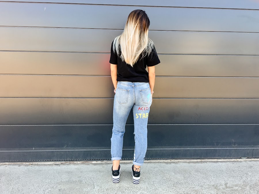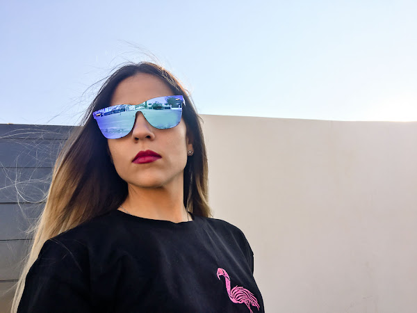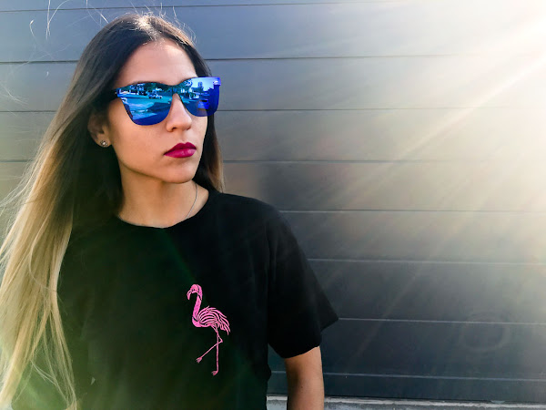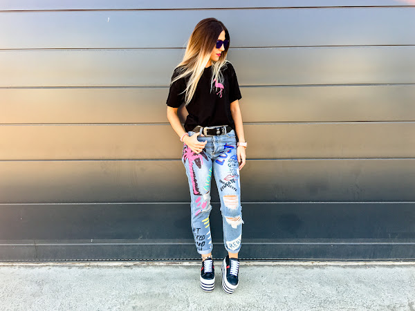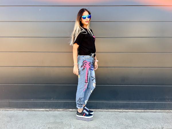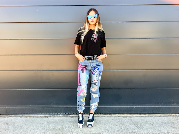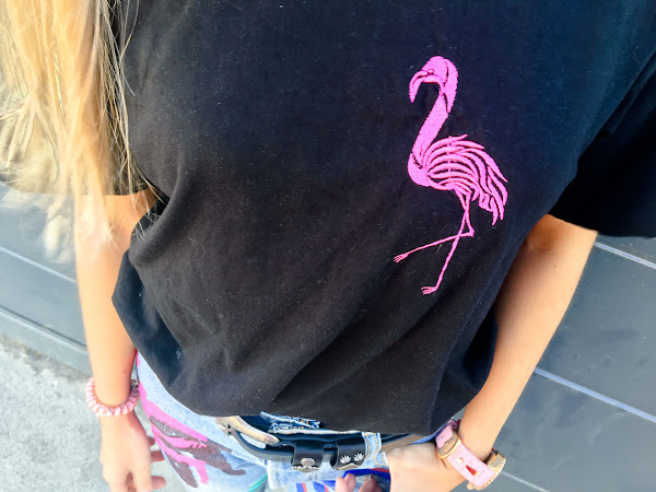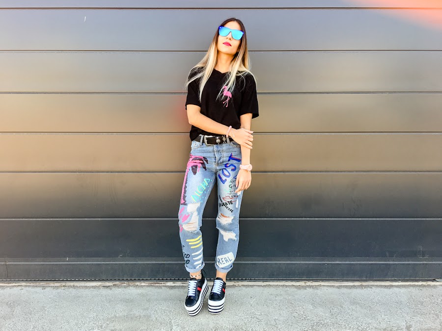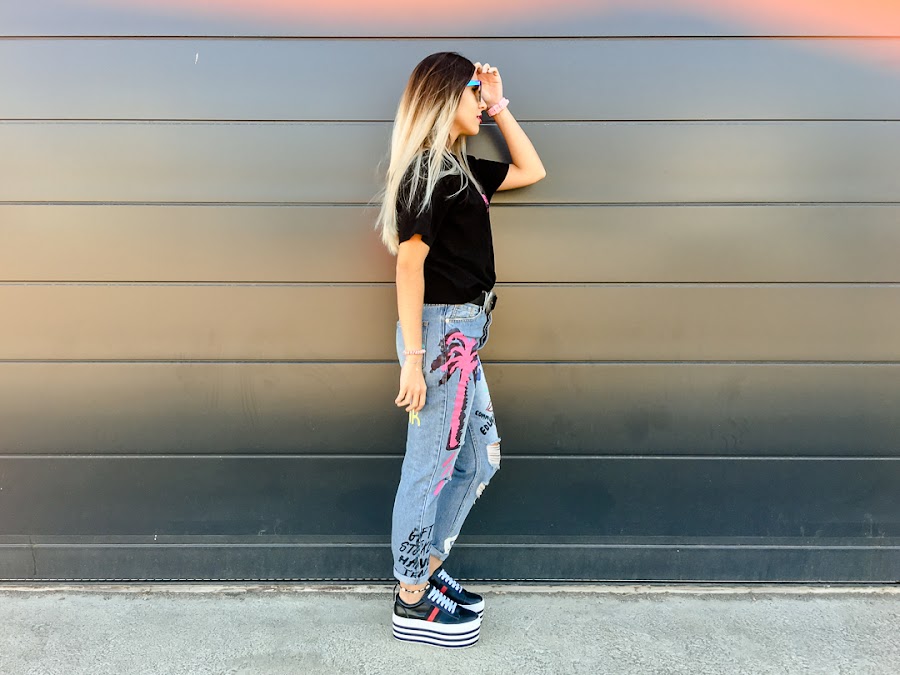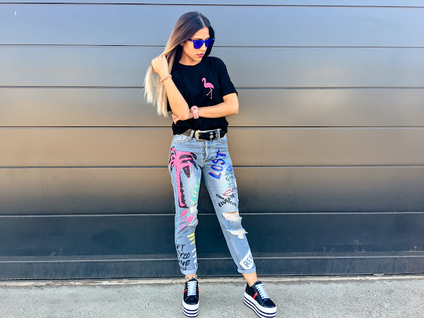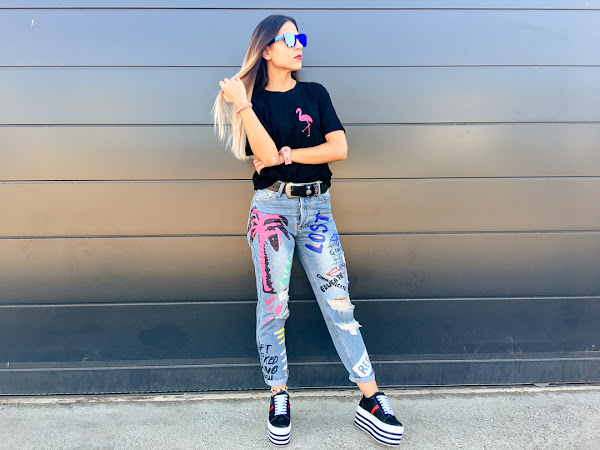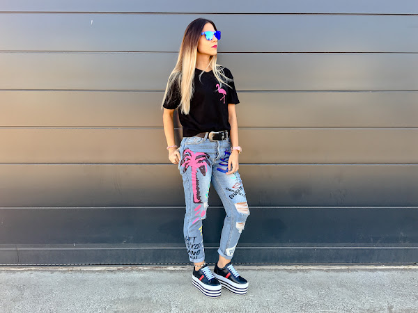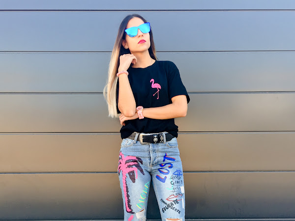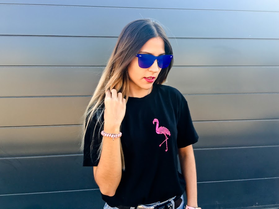 Hoy os traigo un casual look con una camiseta de manga corta, negra con un flamenco bordado en el pecho de DELOUKSTORE (por cierto, me encantan los flamencos), unos jeans súper chulos estampados con letras y una palmera gigante rosa en una pierna. Es de ZAFUL, y es que me en-can-ta!