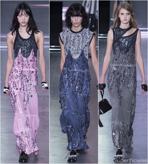 En esta colección hay diversas piezas que crean un estilo ecléctico, como por ejemplo, estos vestidos largos con toques metalizados combinados con mitones y zapatos masculinos.