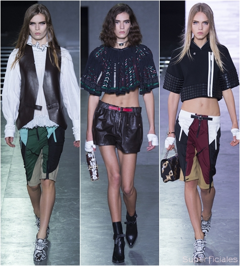 En la parte de arriba vemos prendas de piel, transparencias, y crop tops. Podemos combinarlo con los pantalones bermudas, shorts, pantalones largos estampados y faldas abullonadas.