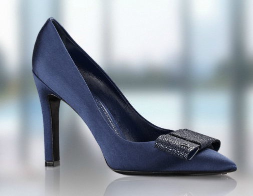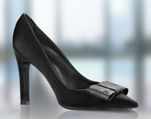 Empezamos con este salón de tacón en satén, adornado con un gran lazo de piel de galuchat metalizada con las iniciales LV y de 10 cm de tacón. (680? aprox.)