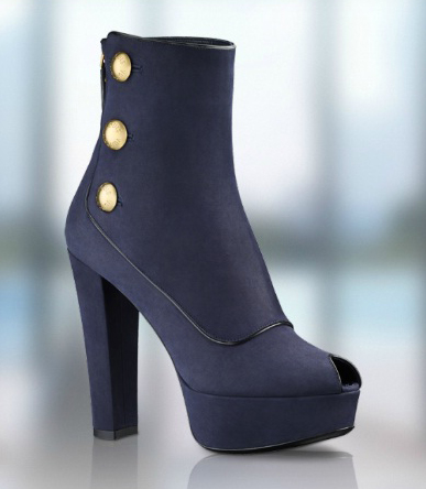 Y por último, los que a mi parecer son los mejores de toda la colección, estos stilettos en piel de ante, con plataforma y de inspiración parisina. El candado Louis Vuitton en la parte trasera, el tacón dorado de 11 cm y la puntera semiabierta los hacen ideales para combinar con cualquier little black dress. (640? aprox.)