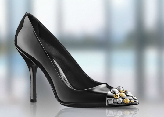 Salón de piel de becerro de charol, de 9"50cm de tacón, incorpora una llamativa puntera de metal decorada con remaches Louis Vuitton en diferentes formas, tamaños y colores. (905? aprox.)