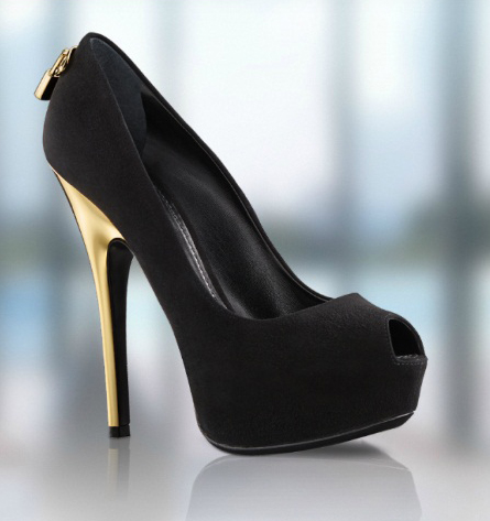 Y por último, los que a mi parecer son los mejores de toda la colección, estos stilettos en piel de ante, con plataforma y de inspiración parisina. El candado Louis Vuitton en la parte trasera, el tacón dorado de 11 cm y la puntera semiabierta los hacen ideales para combinar con cualquier little black dress. (640? aprox.)