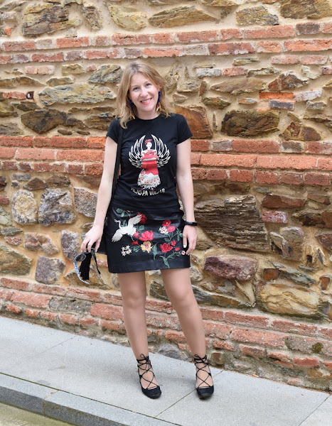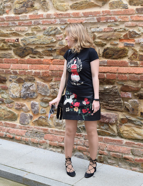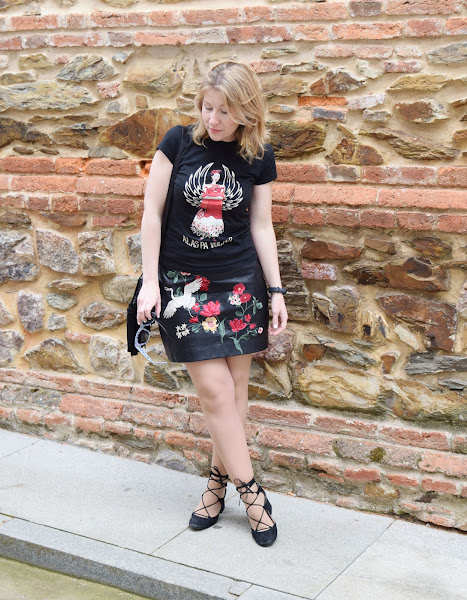 La falda ya ha salido por aquí en diferentes versiones, una mini de polipiel con bordados atemporal, que sirve para cualquier época del año en función de cómo se combine.