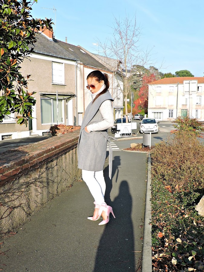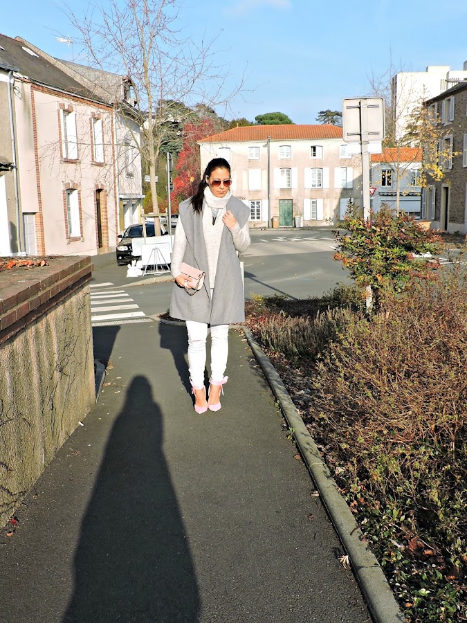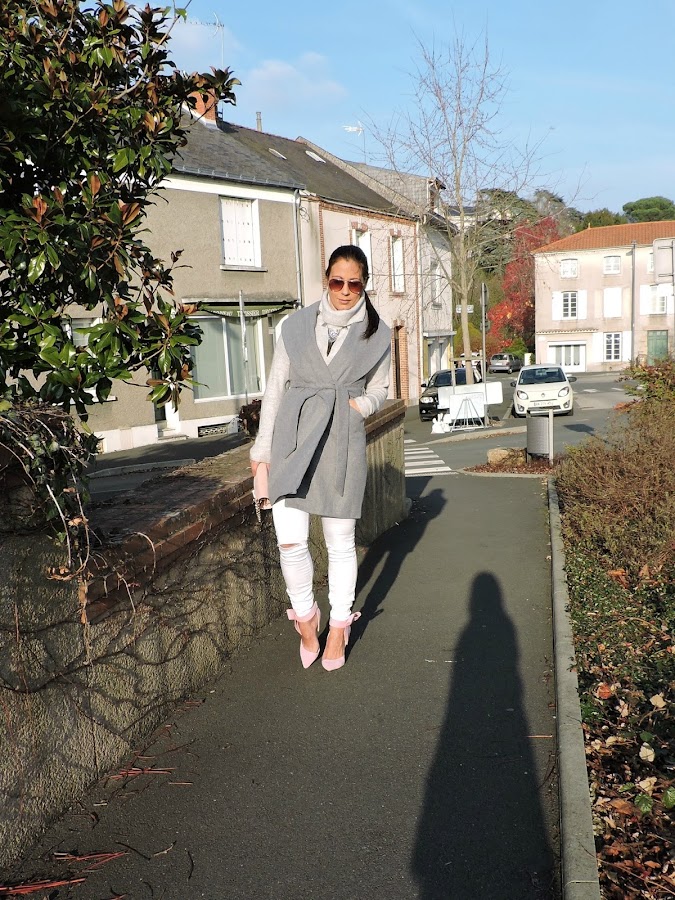 hoy lo combino con un jersey de lana super calentito y unos ripped jean en blanco, y para darle un poco de color opte por los zapatos rosas de New Chic y este bolso de Rosegal