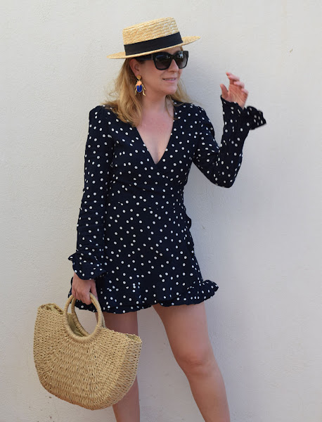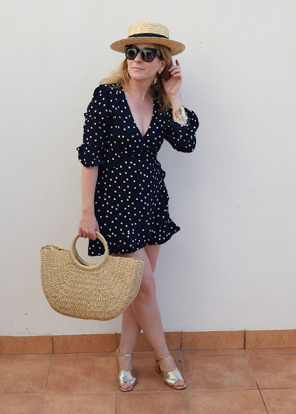 Me gusta añadir prendas veraniegas para rebajar el aire más formal del tono de fondo del mono, como un capazo beige y un sombrero canotier, que me pongo poco, todo hay que decirlo, ya que el viento me impide llevarlo como debiera.