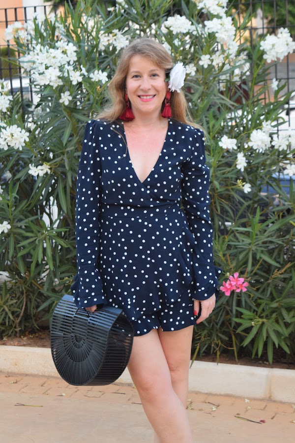 Primero porque al ser mono con pantalón es más cómodo que un vestido. Y segundo porque basta añadir un par de flores y un toque rojo para estar flamaneca total, a mi estilo claro!