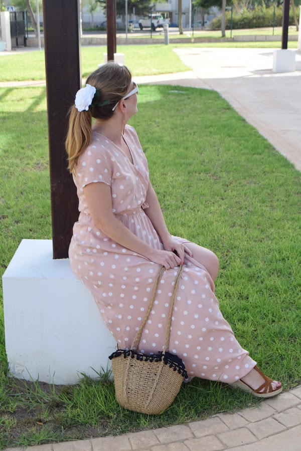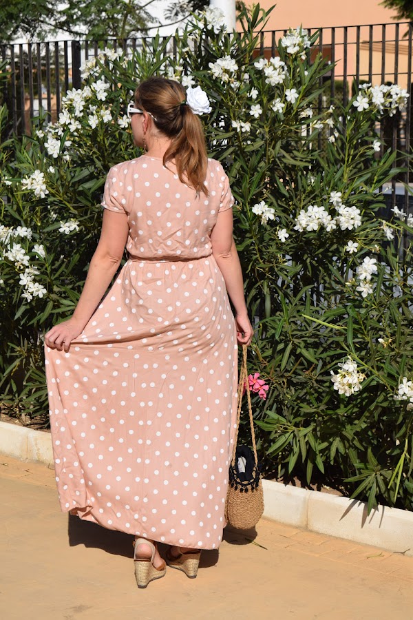 El caso es que el primer día de quedada con los amigos, ¡sin niños!, me planté mi nuevo vestido rosa de lunares blancos, pendientes grandes y una rosa en el pelo.