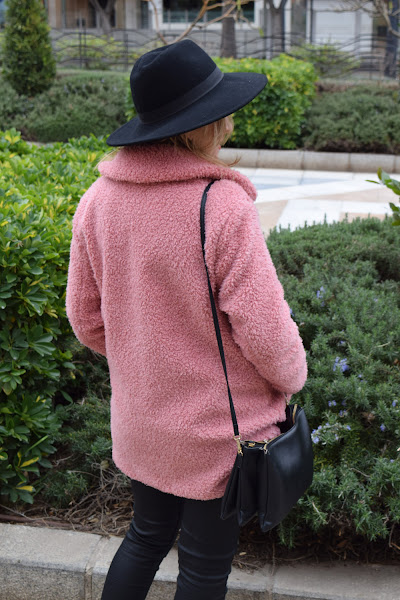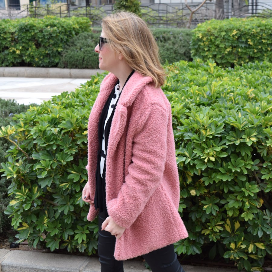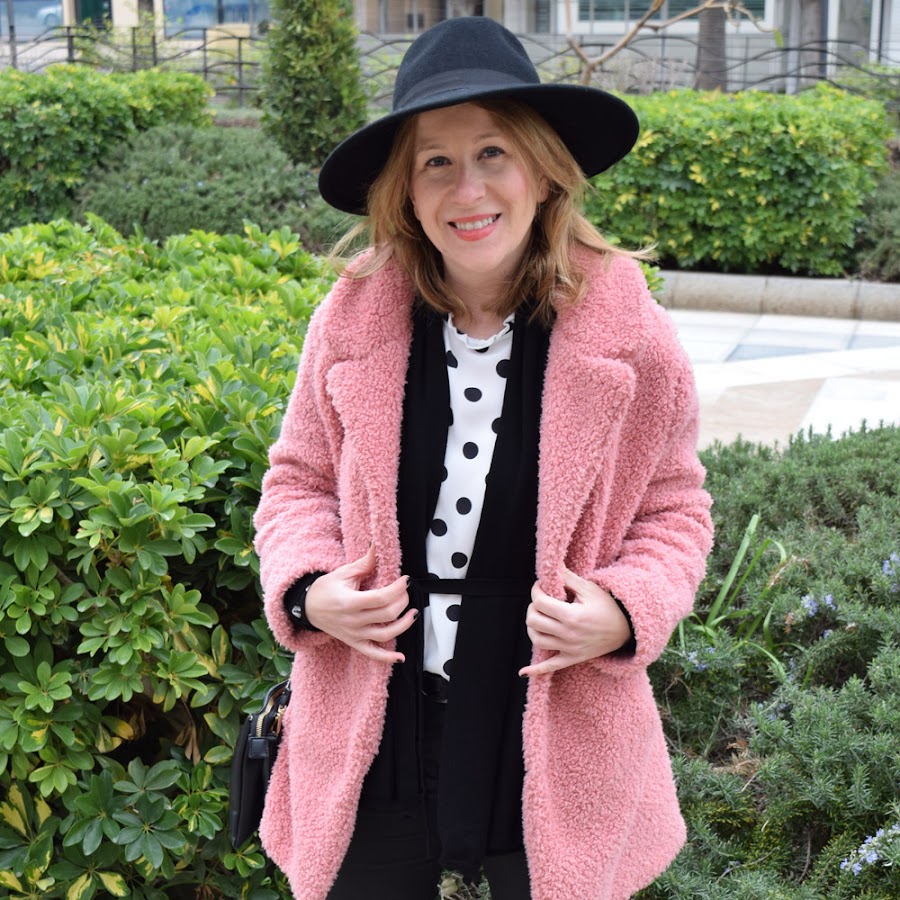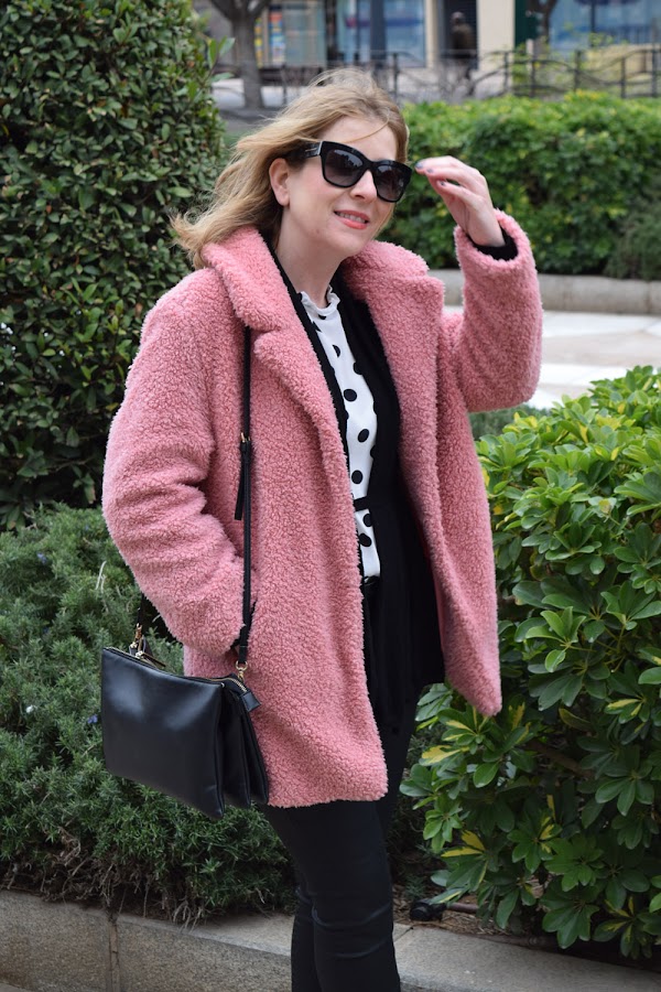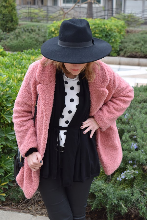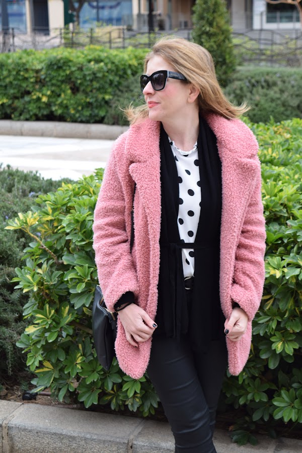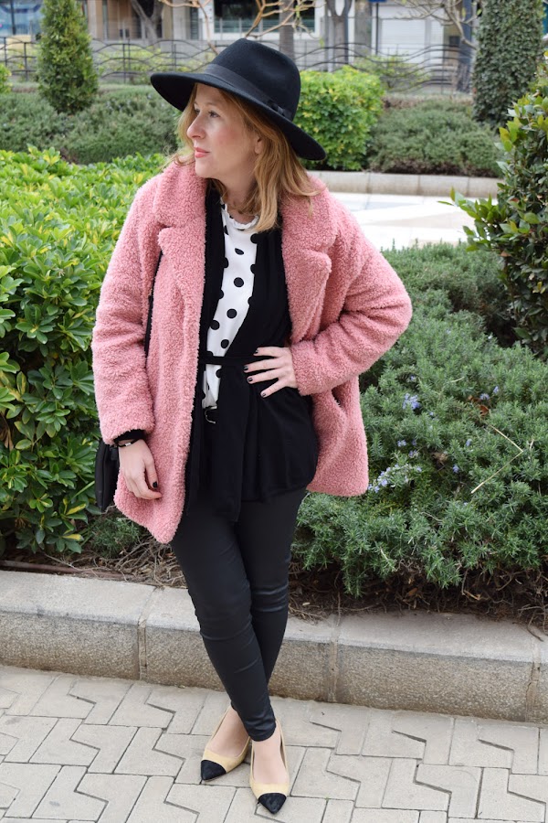 En esta caso con prendas en negro, que hacen destacar más los lunares, y con el toque rosa del abrigo. Casi me gusta más este color suave para celebrar San Valentín.