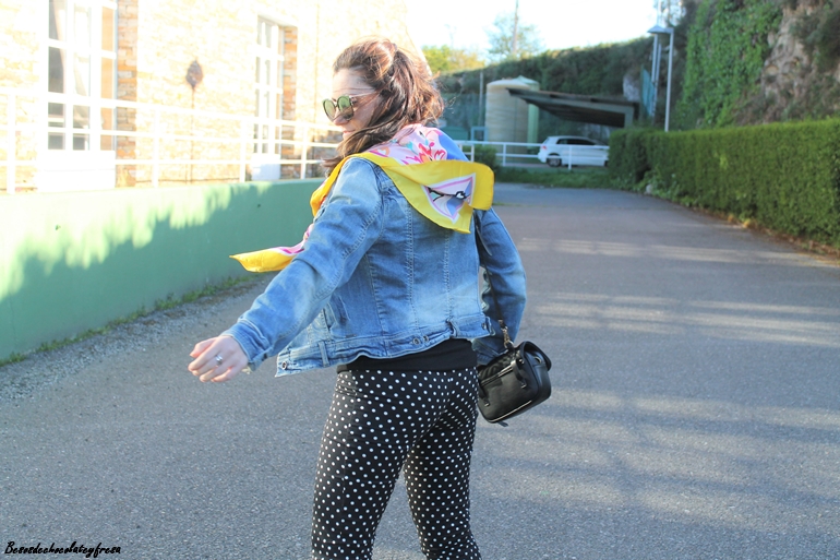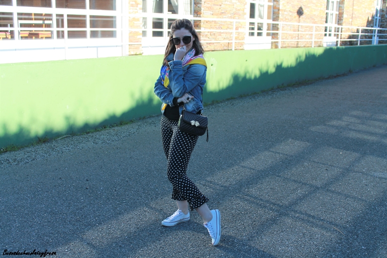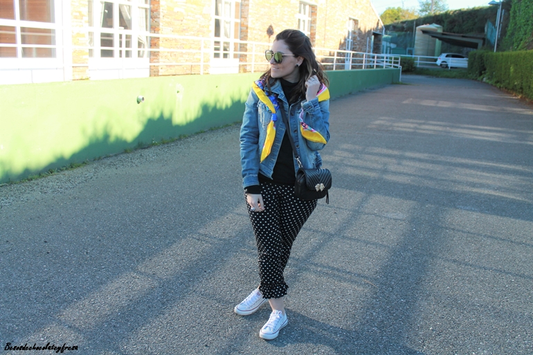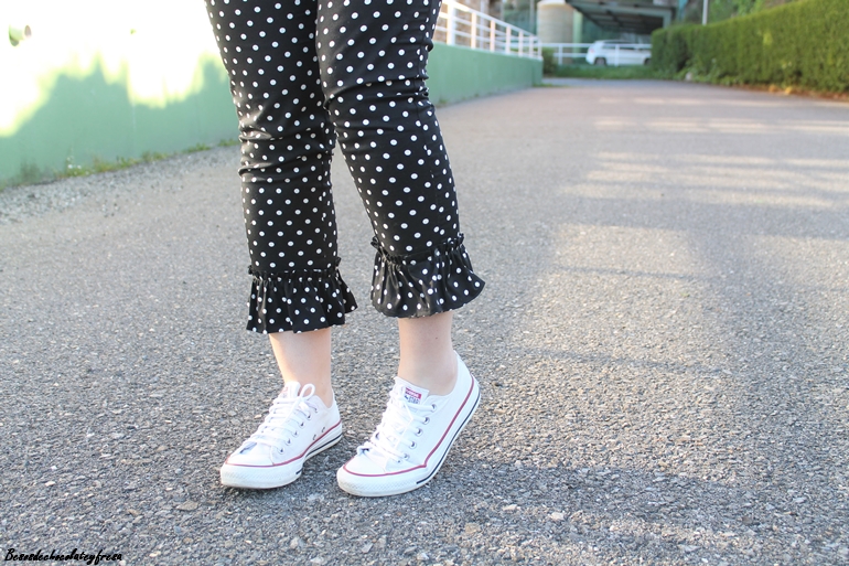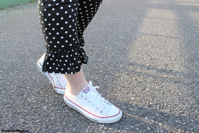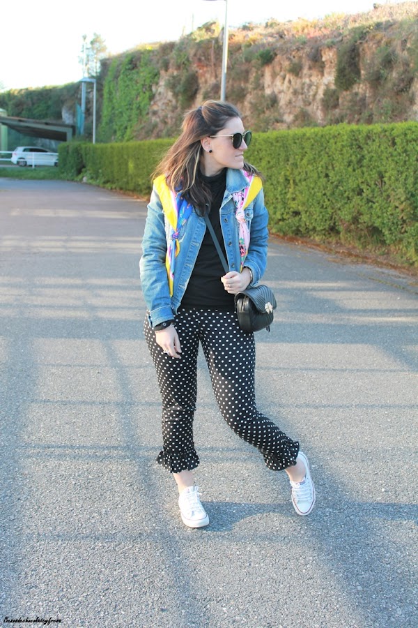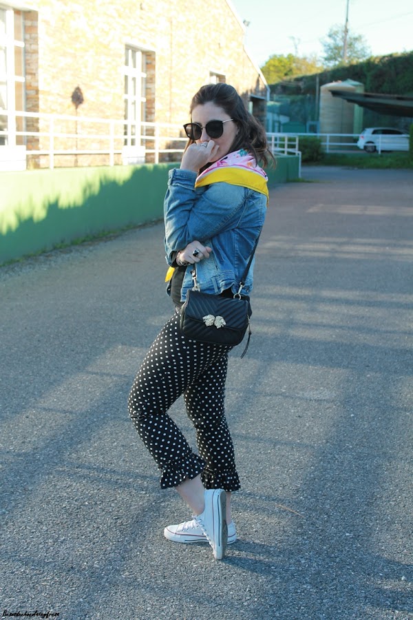 En el look de hoy os traigo esta tendencia en los pantalones que a simple vista son los típicos clásicos negros con lunares pero tienen un punto diferente en el bajo con el detalle de volantes a lo folclórica y que le da mucho rollazo y personalidad.