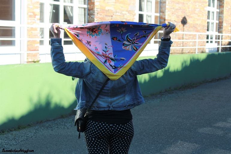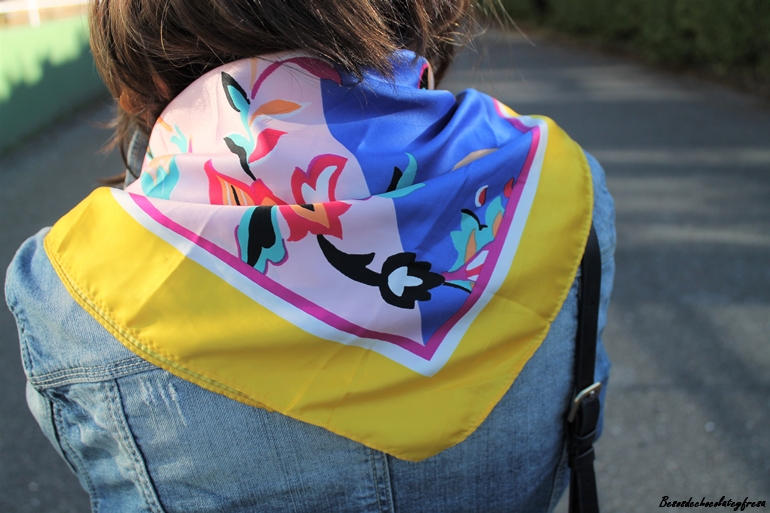 Blanco y negro con un adosis pequeña de estampado podría definirse el outfit de hoy combinando los pantalones con sweater finito negro de cuello cisne, tejana, sneakers y pañuelo multicolor en pico y anudado en los extremos (otra manera de llevar nuestros pañuelos y pañoletas.
