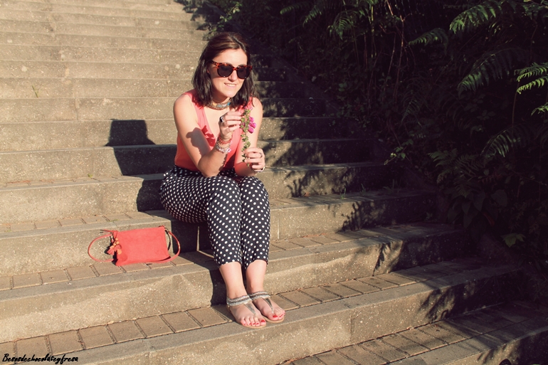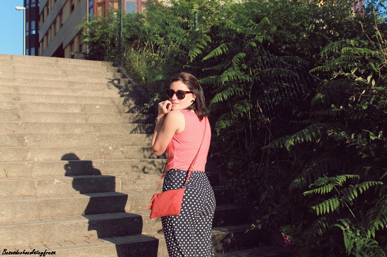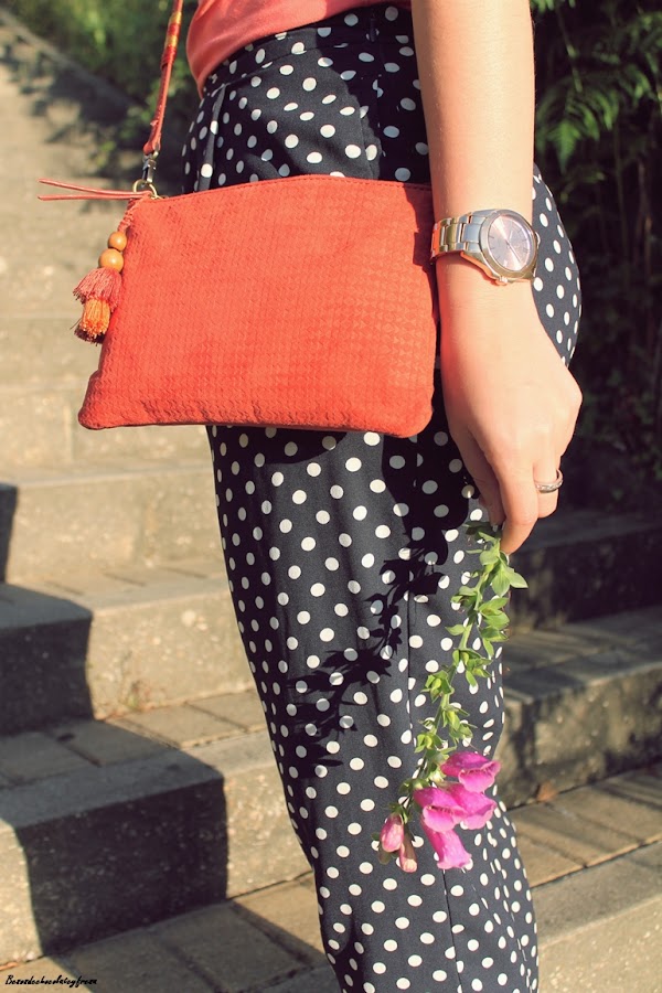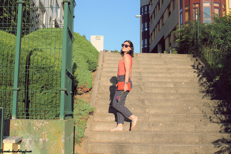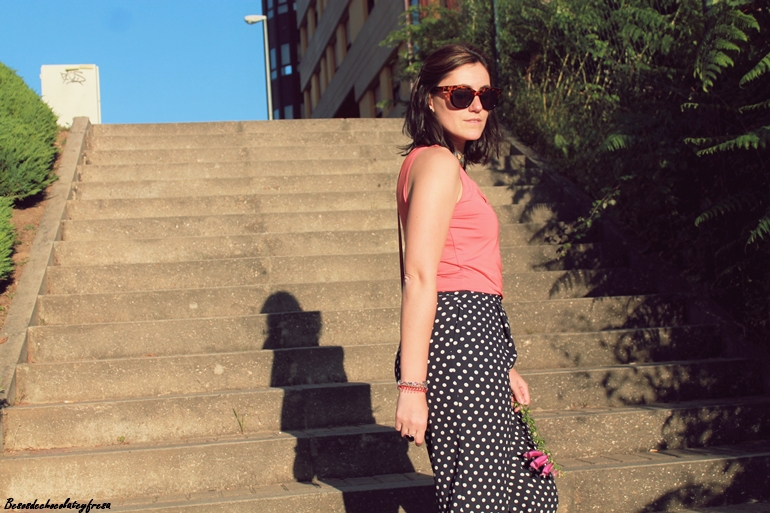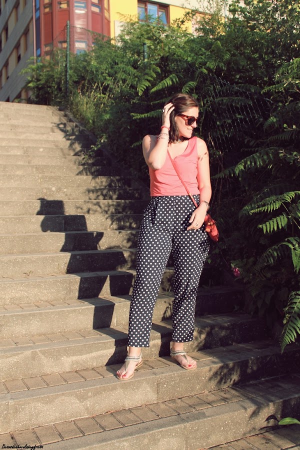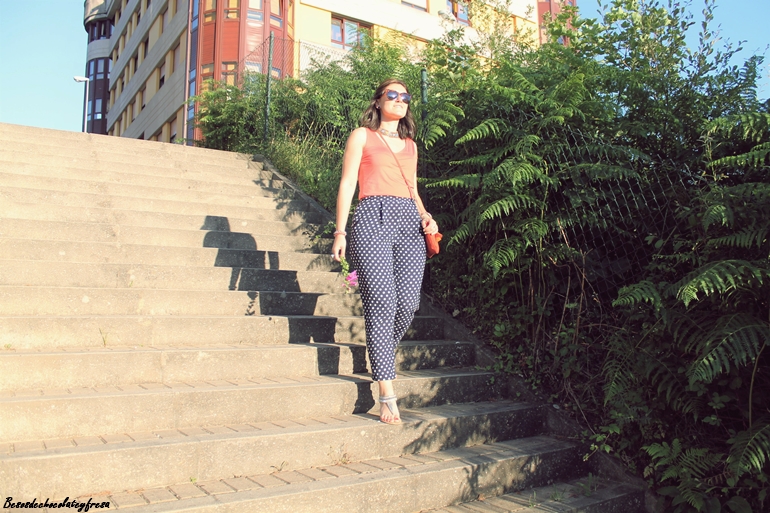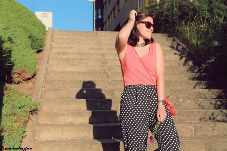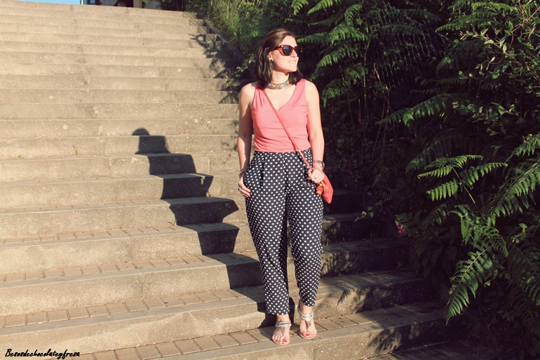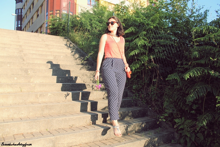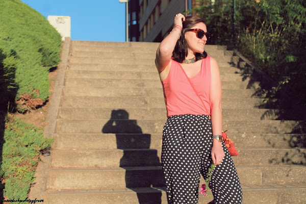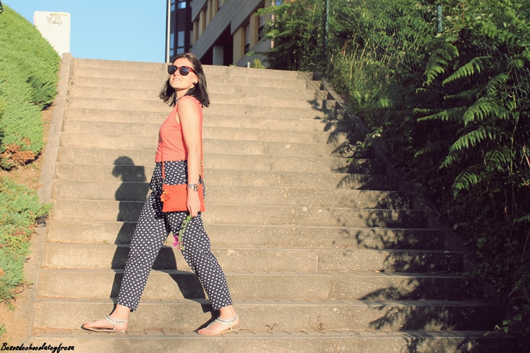 Una de las cosas que más me gustan de la moda es hacer looks en los que mezclamos estampados y colores saliendo de los estilismos monocromáticos del invierno. Como es el look de hoy compuesto por estampado de lunares en el pantalon y combinando dos colores que me encantó nada más ponerlos, azul marino con coral.
