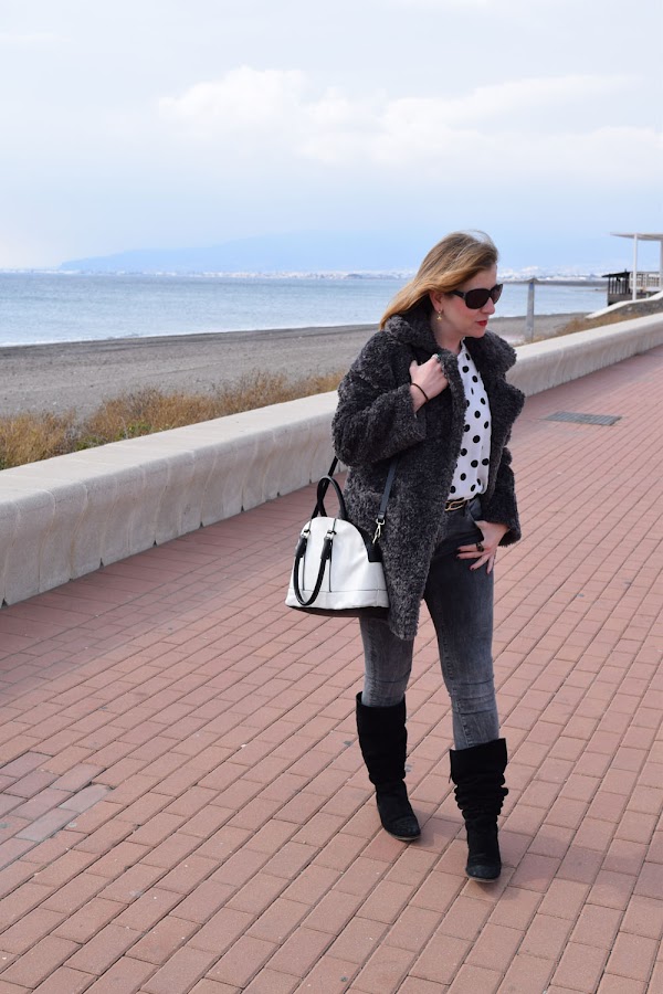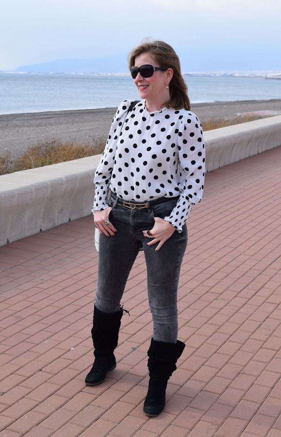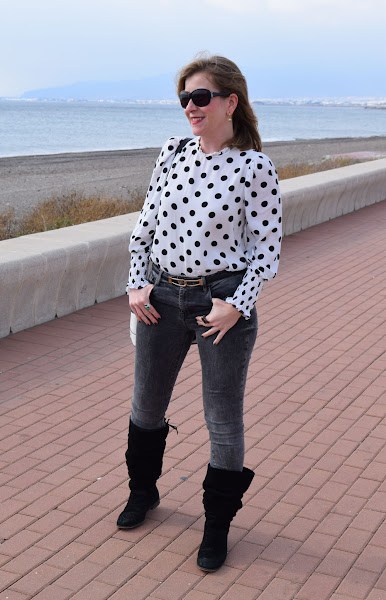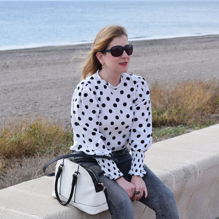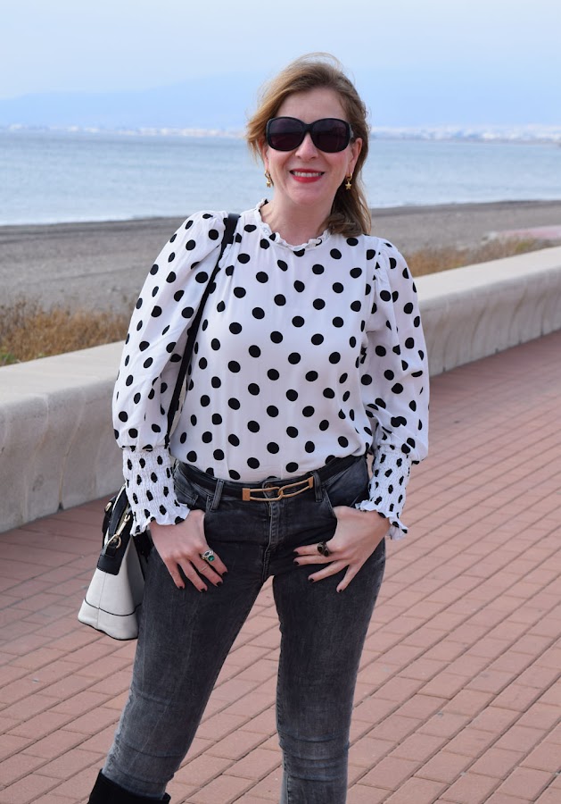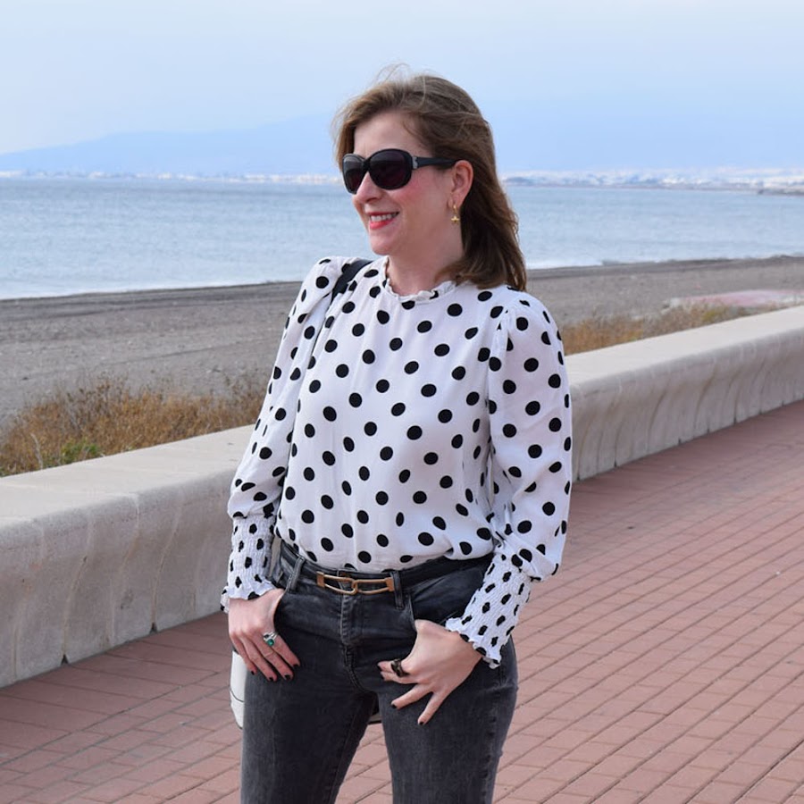 En este caso la he combinado con un pantalón gris y un abrigo del mismo color. Poco más para dejar todo el protagonismo a la blusa de lunares.