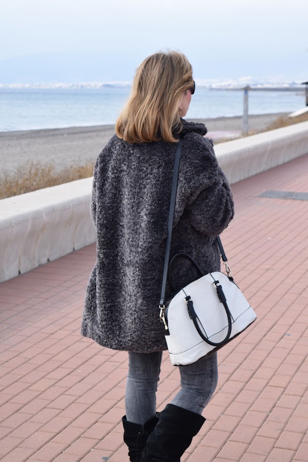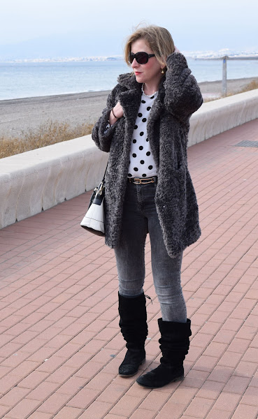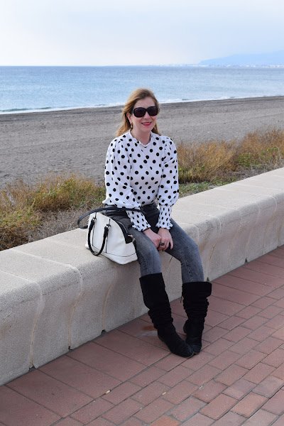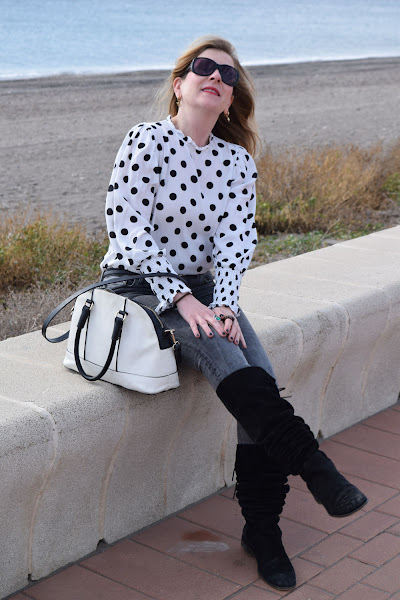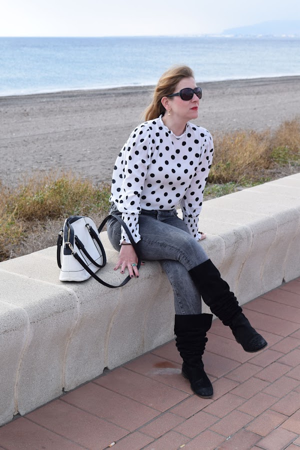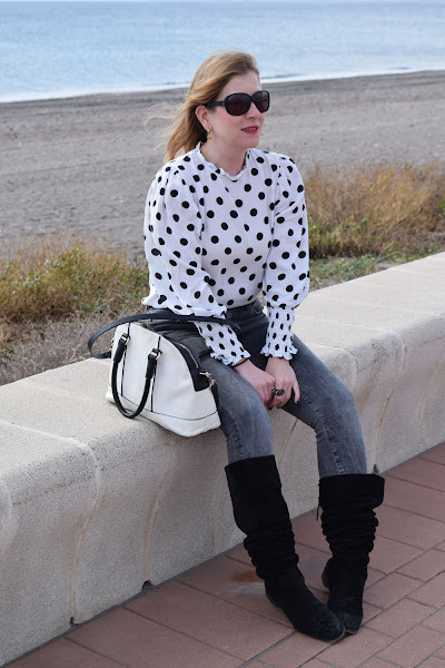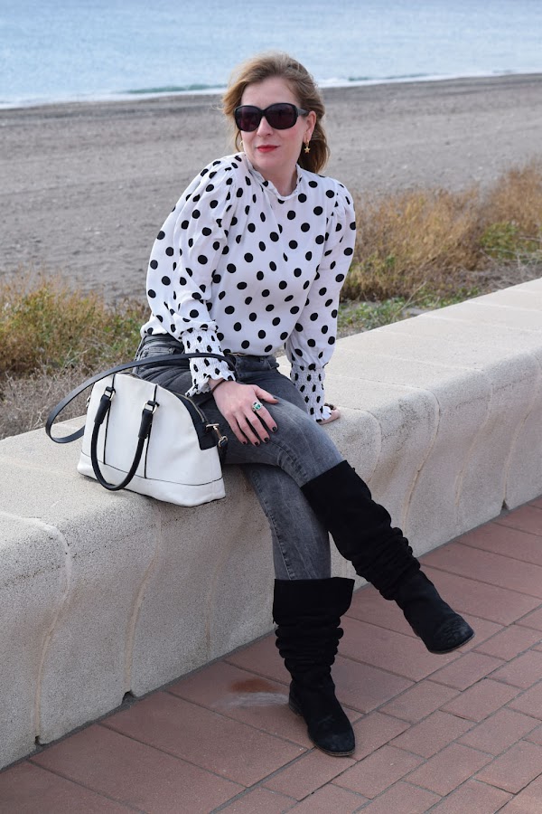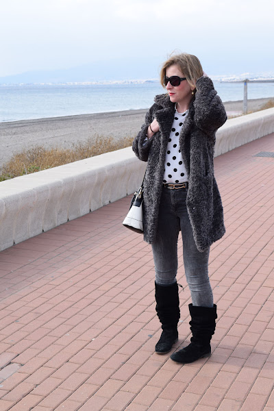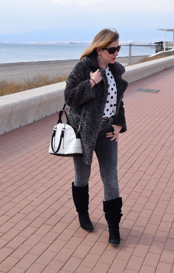 En este caso la he combinado con un pantalón gris y un abrigo del mismo color. Poco más para dejar todo el protagonismo a la blusa de lunares.