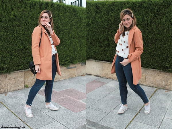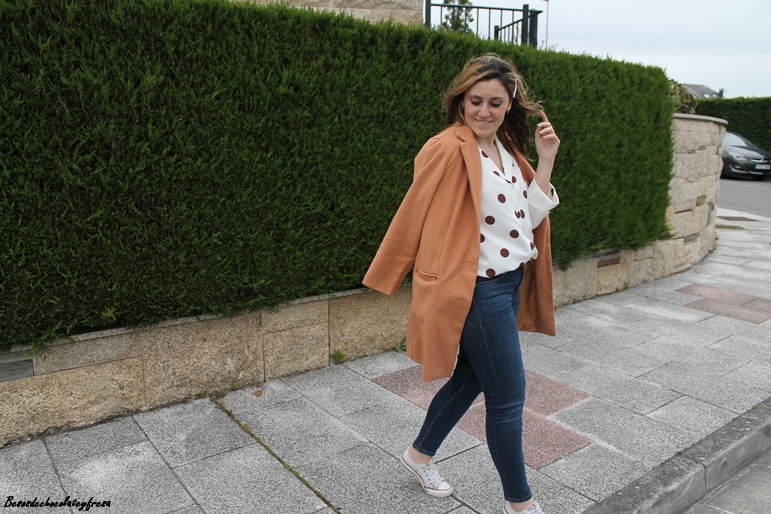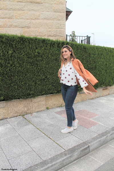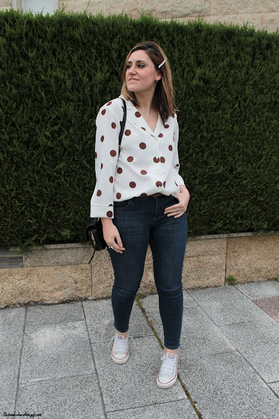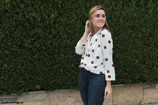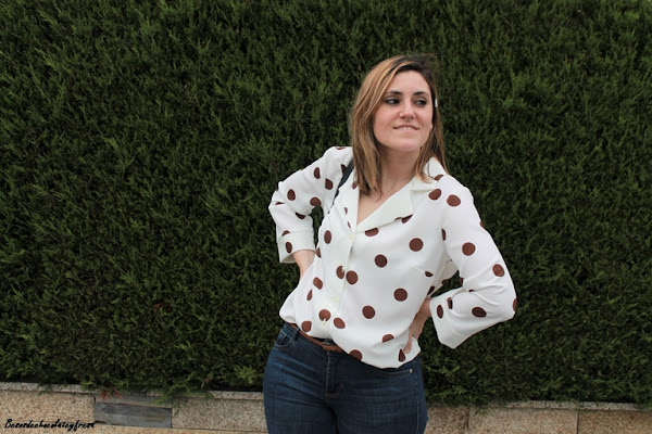 Y no tienes excusa para hacerte con una blusa sea del estilo que sea de estampado de lunares como esta que os propongo en el outfit de hoy con botones hasta media altura haciendo un cuello pico de camisa abierto, lunares en marrón sobre fondo crema en una tela vaporosa de gasa/seda