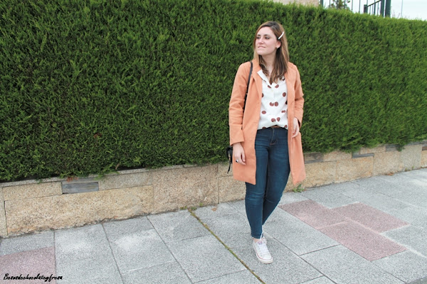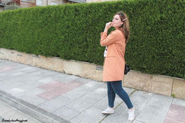 La combiné con jeans para hacer un look entre areglado por parte de la blusa y casual por los jeans y complementos. Abrigo en color camel, bolso negro y converse junto con pinza de perlas en el pelo que le da un toque chic.