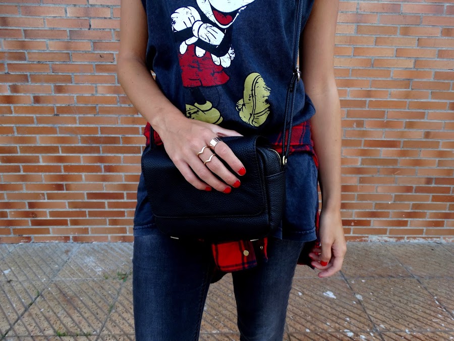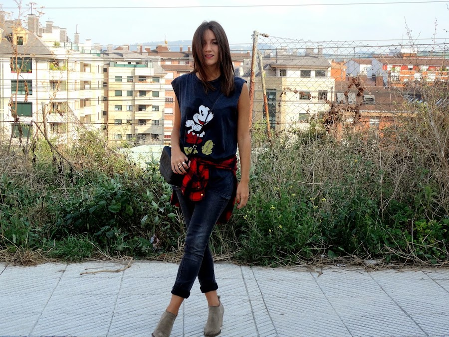 En cuanto al look de hoy es bastante cómodo. Llevo mi camiseta favorita de Micky y anudada a la cintura camisa de cuadros, para estos días en los que a partir de las ocho "refresca" no las apeo, hacen tan bien de complemento cómo de abrigo. En los pies botines de ante de Zara, espero que os guste el resultado.