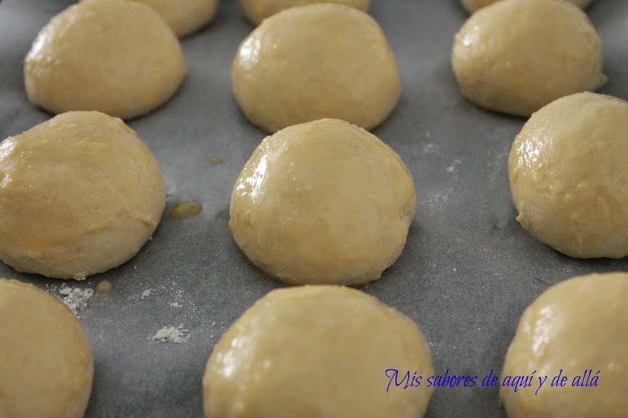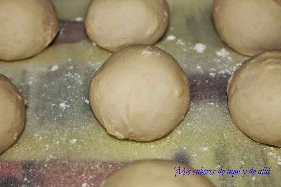 NOTA: El amasado se puede hacer de una vez o a intervalos, un par de minutos de amasado y otros tantos de reposo y aunque es más largo el proceso, metemos menos las manos en la masa... En esta ocasión, en vez de esperar a que la masa doblara el volumen, la metí en el frigorífico durante 24 horas y se amasó practicamente sola. El frigorígico es una gran ayuda para los panaderos...Una vez que la masa ha doblado, desgasificamos, y hacemos porciones de unos 50 gr., boleamos y dejamos reposar nuevamente hasta que doblen su tamaño.