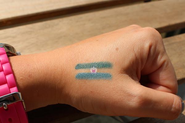 Con este lápiz tengo en un solo producto delineador y sombra en dos tonos verdes, uno clarito tirando a azul y otro verde oscuro. No soy muy de verdes, es un color que no suelo utilizar pero ahora para el veranito dejo mas de lado los delineados negros y los sustituyo por estos colores, también marrones y el morado que ahora veréis. Me ha sorprendido mucho lo bonitos que son los dos colores y lo cremosos que son.
