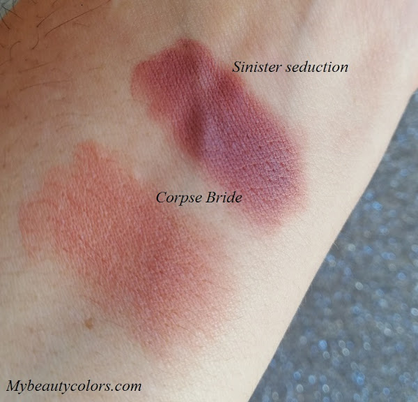 Y el segundo producto que compré de esta colección fueron dos labiales de acabado mate, los tonos "Sinister Seduction" y "Corpse Bride". Si algo destaca en estos labiales es su original packaging con dibujos de calaveras y flores rojas. Además, en la parte inferior tenemos una zona transparente donde se puede ver el tono del labial.