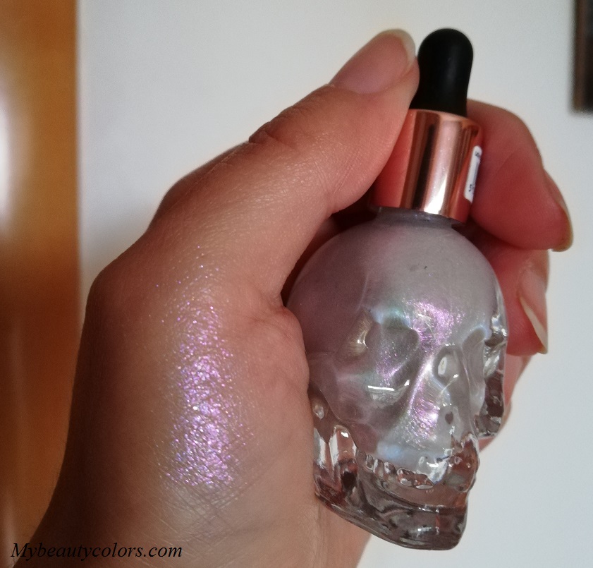 Empezamos con el iluminador líquido LOVER´S WRATH. A primera vista lo que llama la atención es su packaging, un tarro de cristal en forma de calavera, con gotero aplicador. Este en concreto es iridiscente, es decir, tiene destellos de colores y una textura líquida muy fácil de aplicar. Para aplicarlo usamos el gotero y ponemos unas gotas en la zona del rostro que queremos iluminar y lo difuminamos con los dedos para que quede homogéneo y natural. Es un iluminador precioso ya que da una luz muy especial, aunque cuenta con partículas de shimmer. Si queremos un aspecto más natural, debemos aplicar poca cantidad. Si queremos un resultado más llamativo, usaremos más cantidad de producto. También se puede aplicar encima de las sombras de ojos para dar un toque especial. Me tiene enamorada!! Una vez seco, se mantiene fijo hasta que lo eliminamos con desmaquillante. Cuesta 5,99 euros y lo podéis encontrar en Maquillalia.