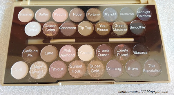 En ella podemos encontrar sombras en tonos crema, rosados, marrones, cobres, azules, morados, verdes, melocotón y negro. También hay sombras con acabado mate, sombras con shimmer y otras más perladas o metalizadas. Cada sombra tiene su encanto y con ellas se pueden crear infinidad de preciosos looks. Las sombras con shimmer son súper especiales y bonitas, eso sí, hay que ir con cuidado porque sueltan un poco de purpurina al aplicarlas. Las de acabado perlado son muy suaves al tacto y fáciles de aplicar y difuminar. Las de acabado mate son un poco más sequitas pero nada escandaloso, también son fáciles de aplicar y de trabajar. Por lo general las sombras mate suelen pigmentar un poco menos pero en esta paleta eso no sucede ya que todas las sombras que tiene pigmentan mucho, incluso las mates. Estoy encantadísima con esta compra y creo que realmente vale lo que cuesta.