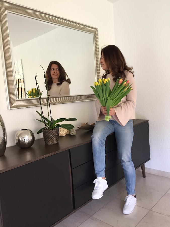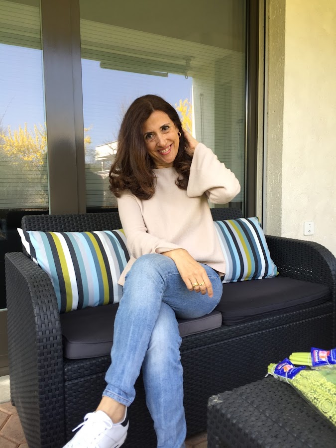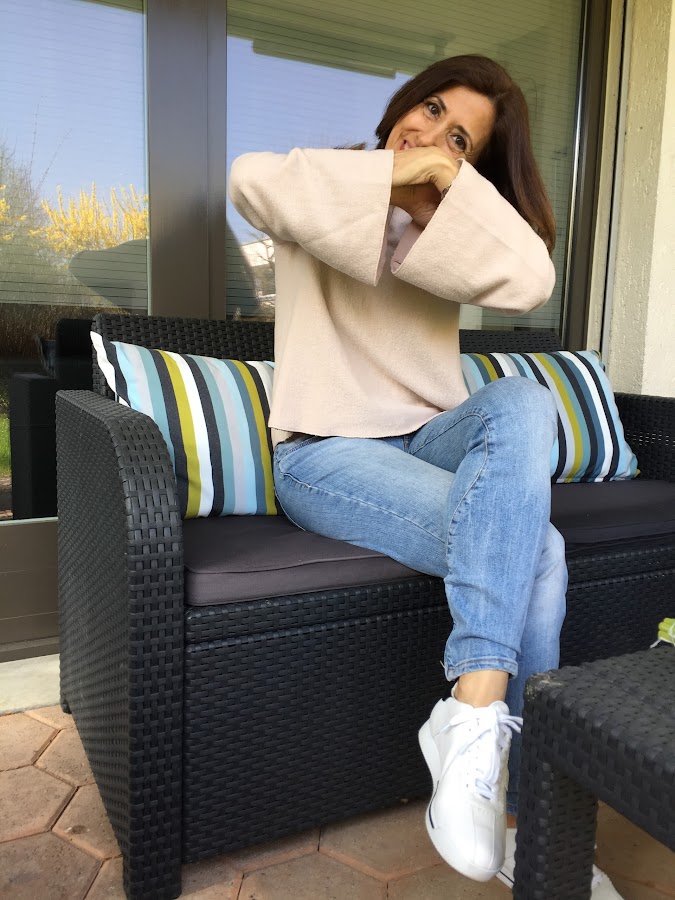 Os dejo fotos con sudadera rosa con mangas de campana, jeans claros y zapatillas blancas.