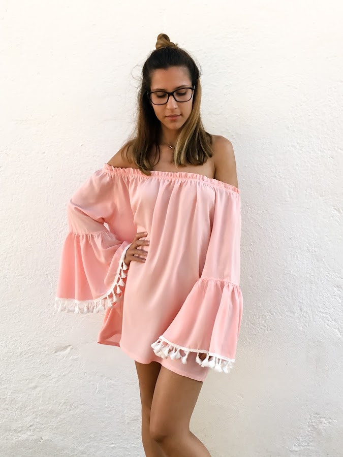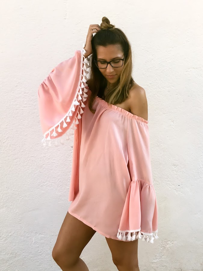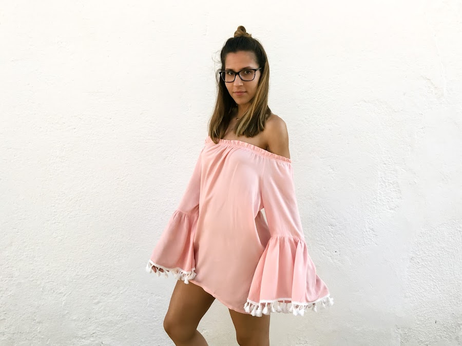 Para todos los que estáis en la playa y no sabéis que llevar, os recomiendo este vestido, perfecto para una tarde de playa o incluso una noche de fiesta en la arena! Yo aún no he podido enseñarlo en la playa, pero ya me queda menos!! Un mini vestido súper fresco, de hombros descubiertos y mangas acampanadas acabadas en pompones. No penséis que por ser de manga larga, vais a pasar calor, porque es súper fresquito!! Y el color rosa es de lo más dulce!!