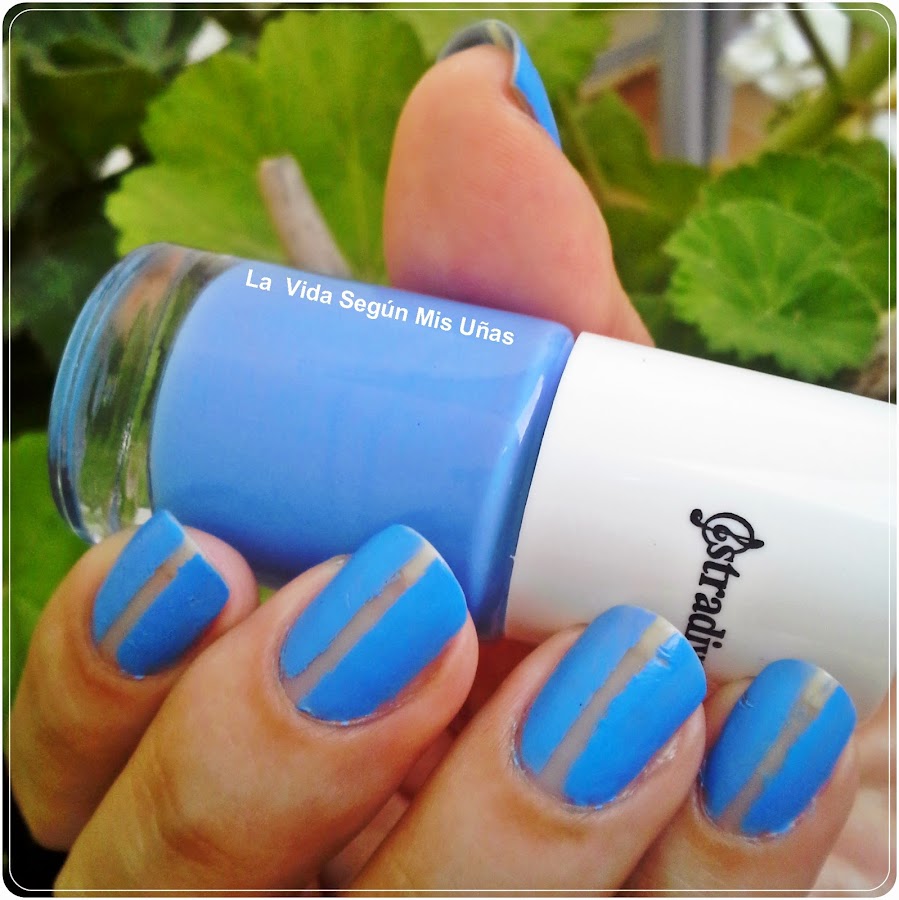 Como era un diseño muy sencillo decidí hacérmelo en todas las uñas. Para ello simplemente utilicé unos nail tape para la raya de en medio y pinte sobre ellas con el esmalte azul. Para finalizar apliqué el top coat matte.