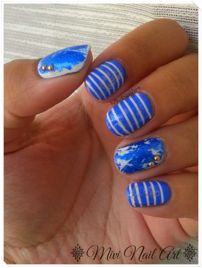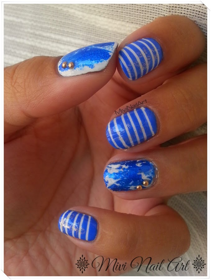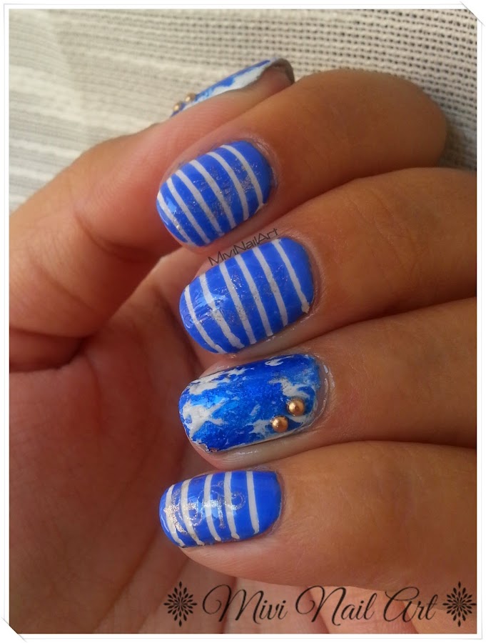 Hoy os traigo una manicura en azul y blanco, con detalles dorados. Al más puro estilo marinero. Además quiero dar las gracias a mi querida Rousandera de "El Cajón de los Esmaltes de Rousandera", por enviarme un paquetito con un montón de cositas, entre ellas unos foils que tenía ya gana de probar ^^.