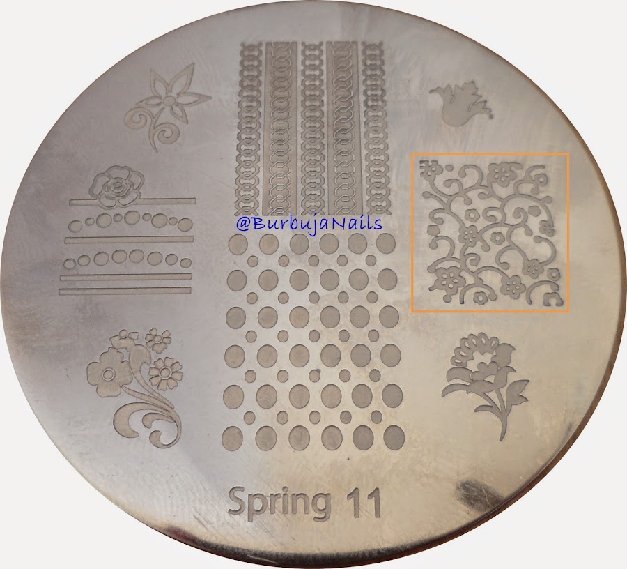 3. Cuando el naranja ha secado estampamos el diseño de la placa con el esmalte azul que hemos usado para esmaltar el resto de las uñas.