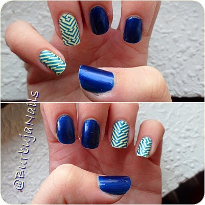 2. Damos dos capas del esmalte vainilla en la uñas del dedo meñique y del corazón y el resto las pintamos de azul.