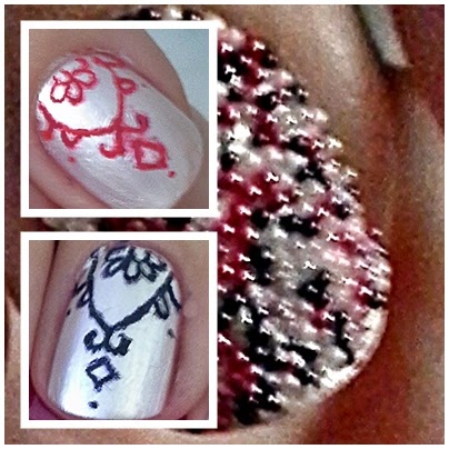 Como veis es un dibujo sencillo hecho con lineas y unos pocos puntitos. Como podéis ver en la imagen decidí alternar los dibujos en rojo y azul oscuro y en la uña del dedo corazón el caviar.