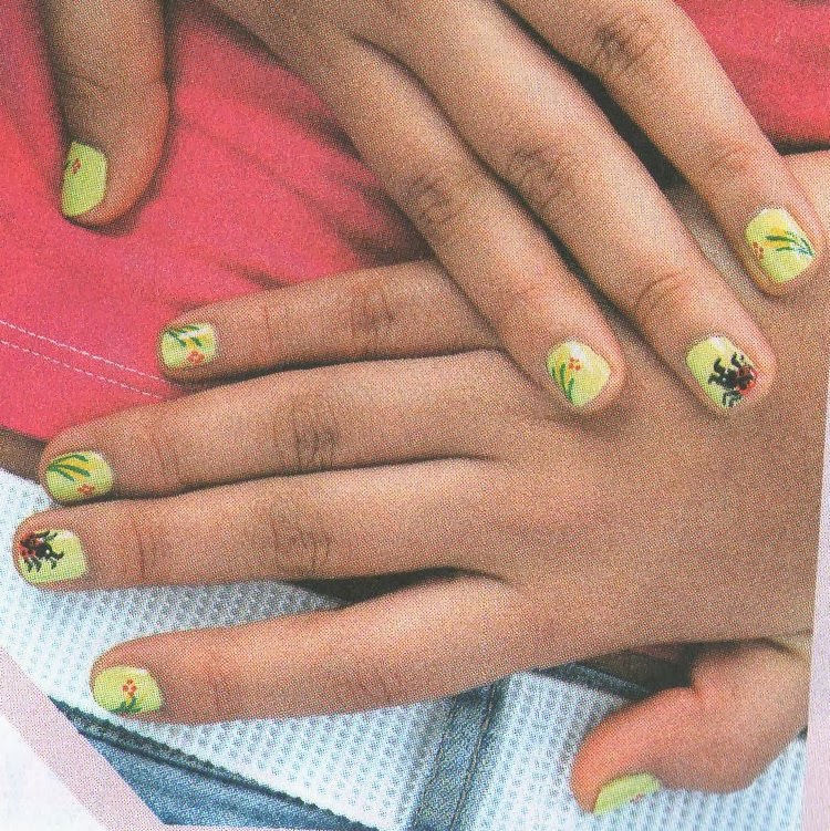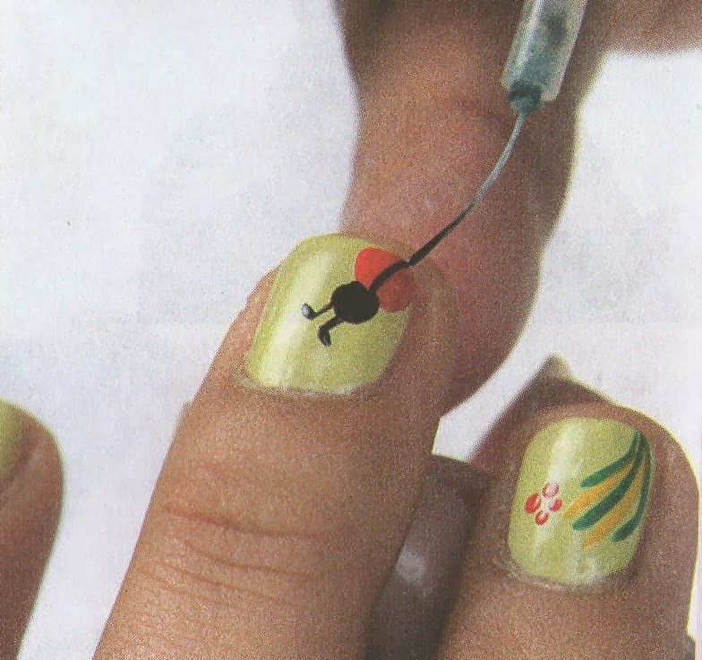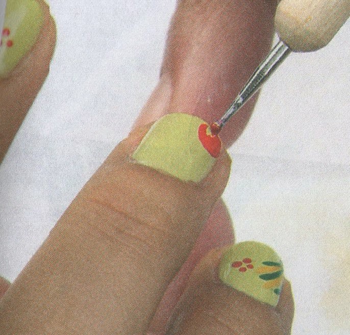 MATERIALES: Brillo. Esmalte amarillo, verde oscuro, blanco, rojo,verde limon, y negro. Punzón. PROCEDIMIENTO: 1-Aplicar fortalecedor de uñas.