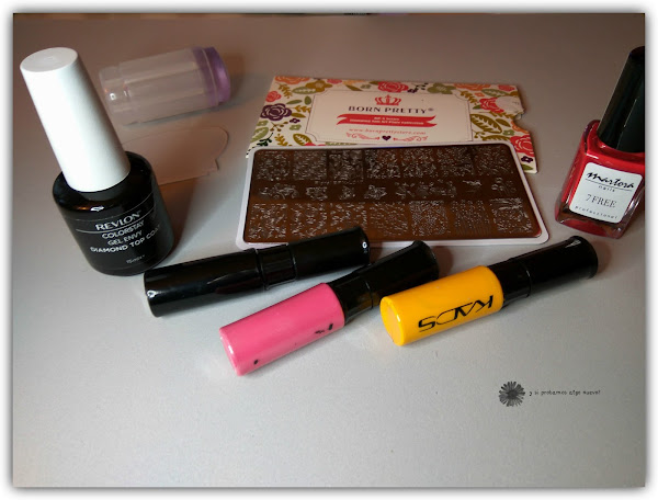 He usado esta placa y para probar he usado dos colores, amarillo y rosa. He usado estos esmaltes de Kads que compré en aliexpress porque tienen arriba una punta y es más fácil dosificar la cantidad de esmalte y también es más fácil pintar en zonas pequeñas, es como un rotulador de punta fina. Mientras espero a que se seque el primer color, he estampado en otro sello y así me parece que aprovecho mejor el tiempo.