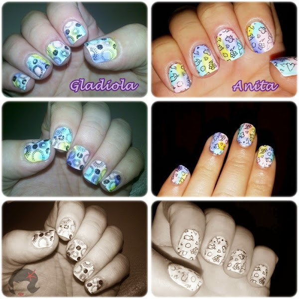 Las dos manis las hice yo, la mía fue el primer intento, la de prueba, porque la realidad es que estampando era malísima (tampoco es que ahora la tengo tan clara!) y por eso me costó levantar el estampado, todas sabemos que a las que empezamos a estampar es muy raro nos salga de una, pero la mani de Anita (mi prima, la que está tan loca por los esmaltes como yo y me compra las novedades en el centro) está mucho mejor estampada porque ya tenía algo de práctica.