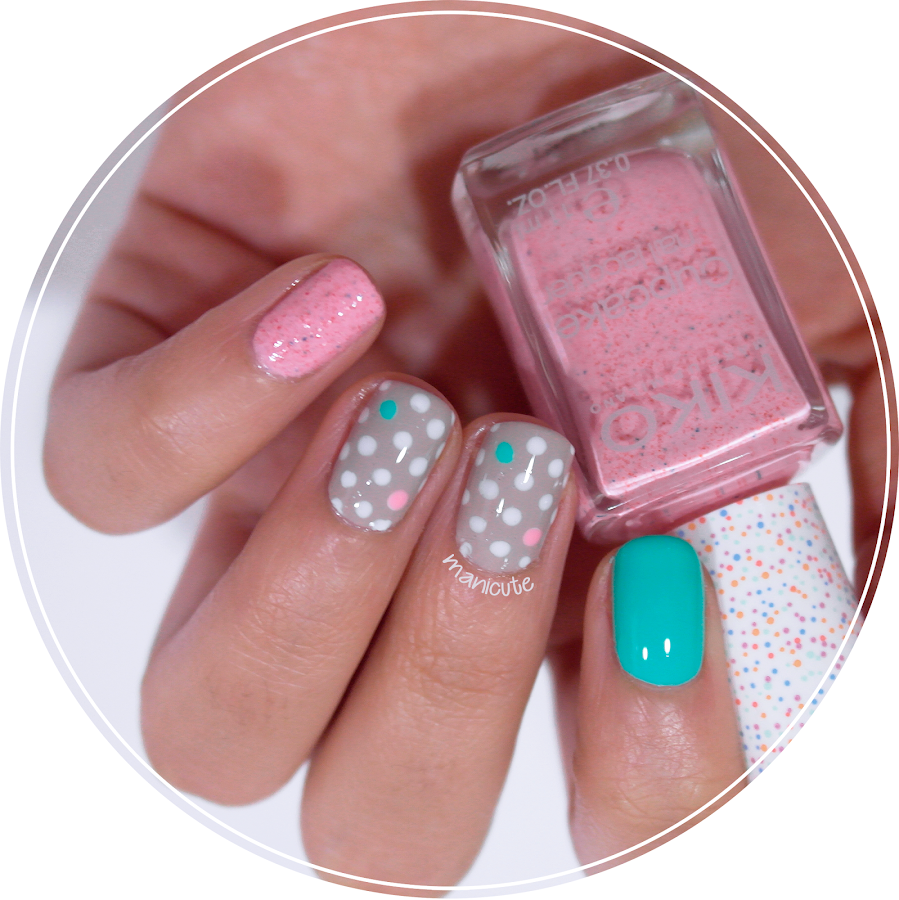 Pulgar, corazón y anular. Ambas decidimos hacer unos polka dots. ¿Por qué? Pues porque nos gustan, quedan muy bonitos y dulces, y nos da la posibilidad de incorporar en ellos el resto de colores del nail art.