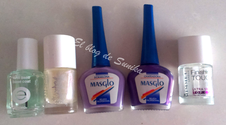 Para proteger las uñas usé como siempre mi base de Essie, luego la francesa con un esmalte blanco de Yves Rocher y el C03 Sky and Snow de Catrice. Sobre la francesa bien seca usando los dos esmaltes de Masglo el Chateadora para las huellas más oscuras y el Dormilona para las claritas. Y finalmente para proteger la manicura el Top coat de Rimmel.