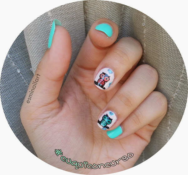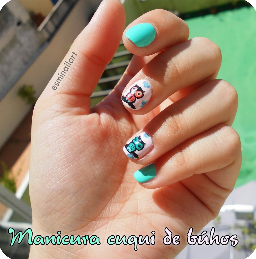 Buscando inspiración me acordé de esta manicura de Cubbiful de búhos preciosa y muy muy dulce. Igual igual no me salió, los colores y los tamaños son diferentes (¡quién me diera unas uñas tan largas!) pero la verdad es que me gustó el resultado, quedé muy contenta porque hacía mucho que no cogía las acrílicas y hacía algo "elaborado".