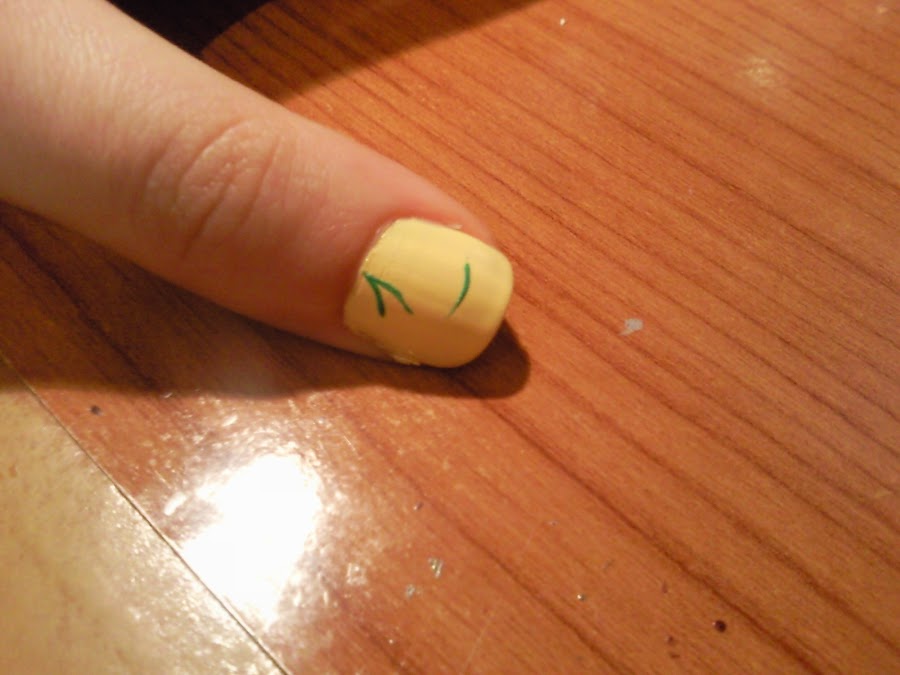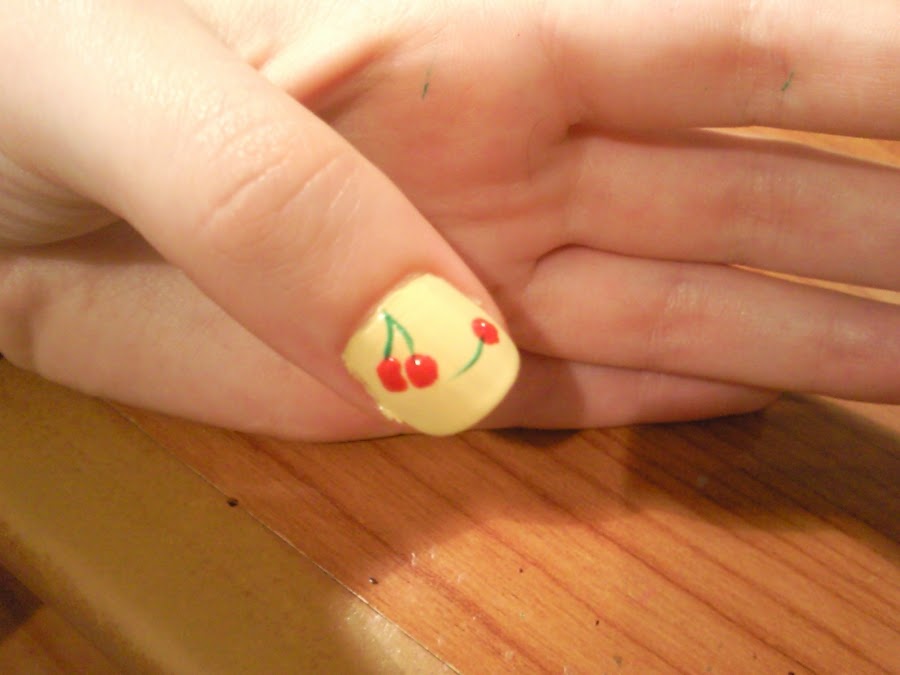 Now, we"re going to do the cherries, step by step. Frist, make the stem with the thin brush and green polish. You can three stems, two o just one.